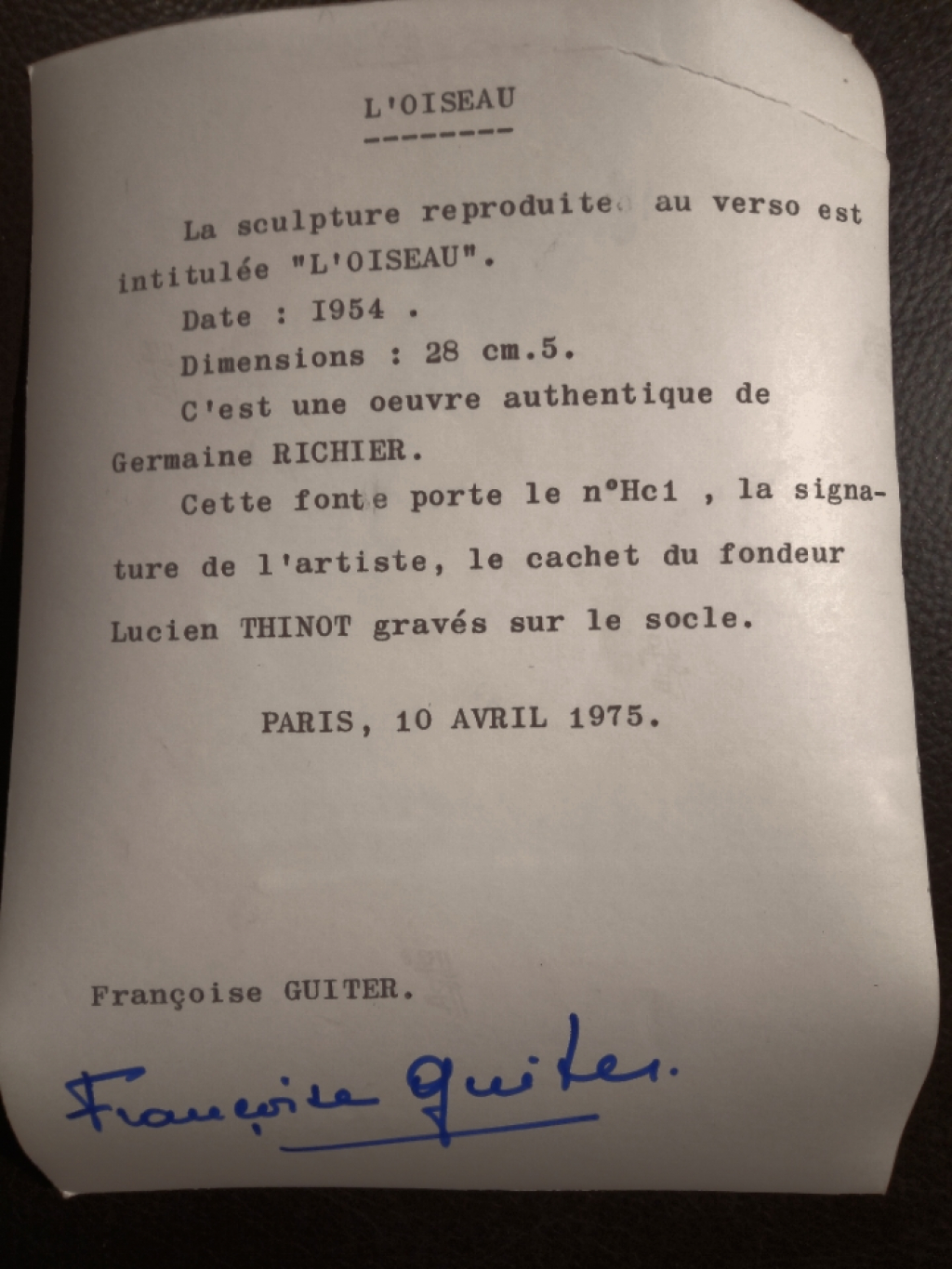 France estimations a reçu la demande d'estimation suivante intitulée par le déposant : L'oiseau de Germaine RICHIER.