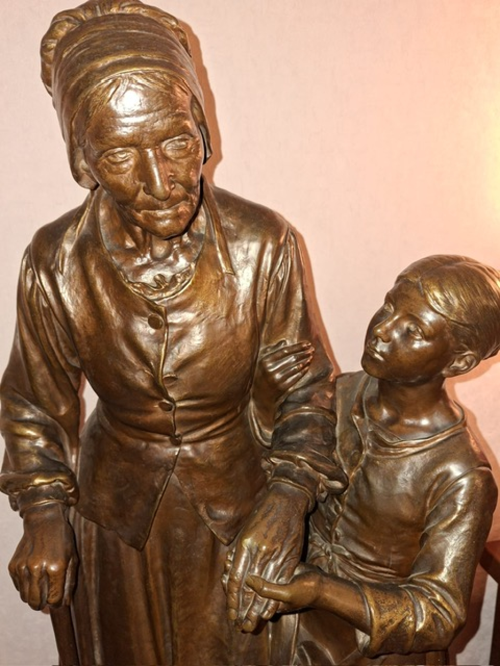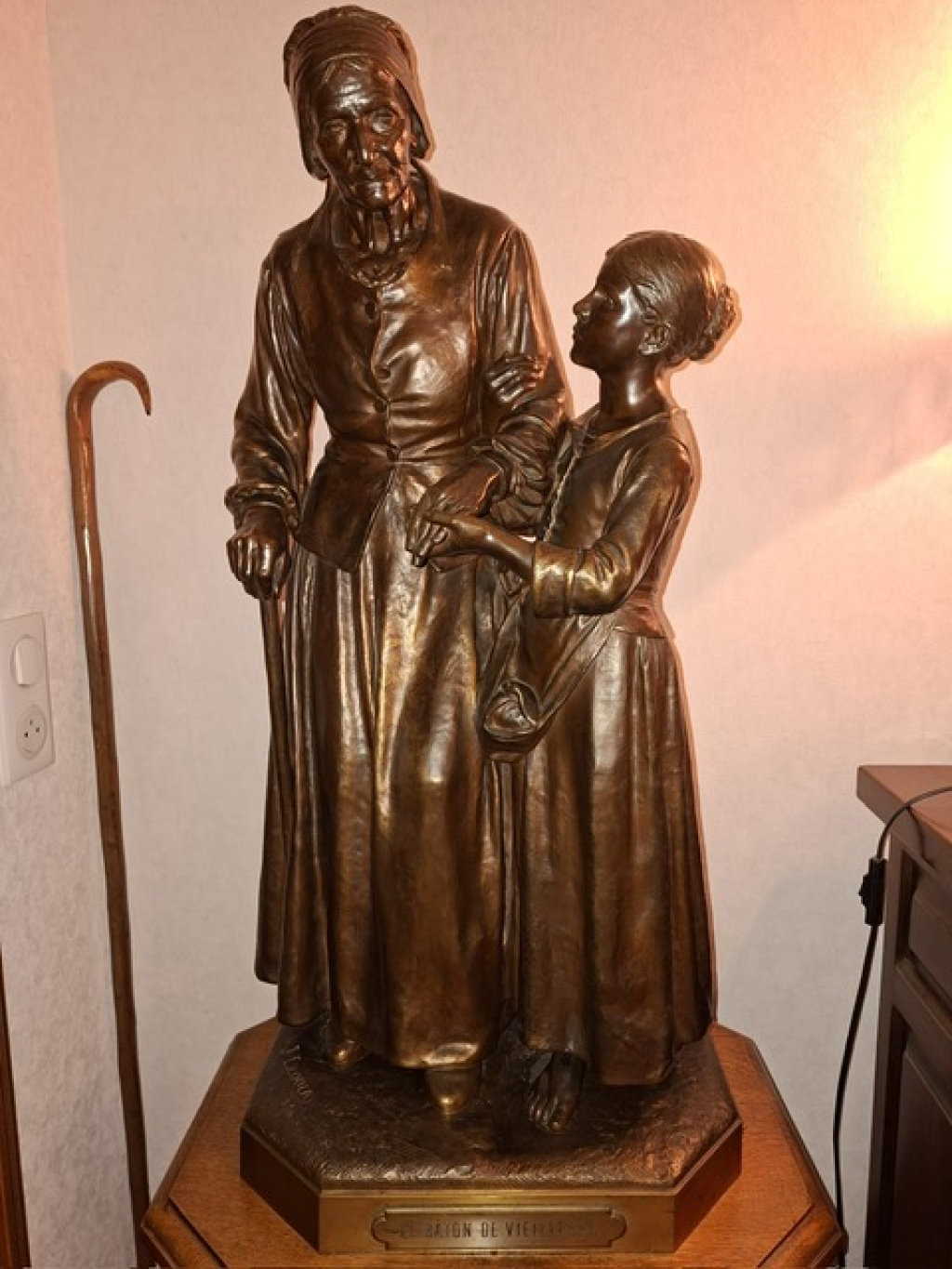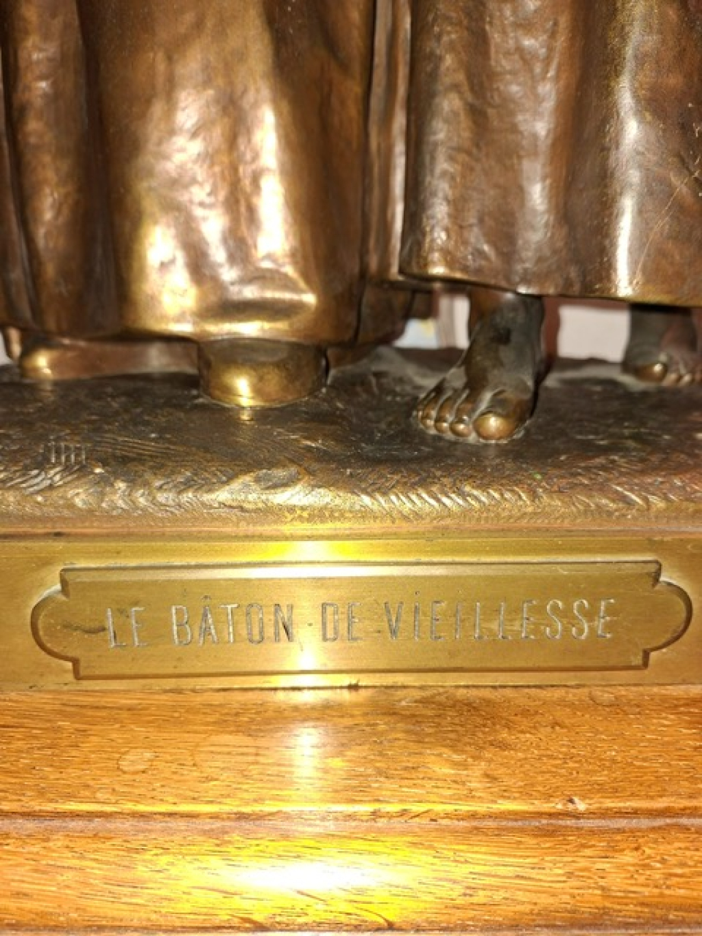 "Statue de Bronze nommée Le Bâton de Vieillesse, signée Jean Escoula. Hauteur de la statue 89 cm, largeur 42 cm, profondeur, 33 cm Meuble en bois hauteur 76 cm, largeur 56 cm, profondeur 45 cm. Poids estimatif entre 25 à 30 kg."