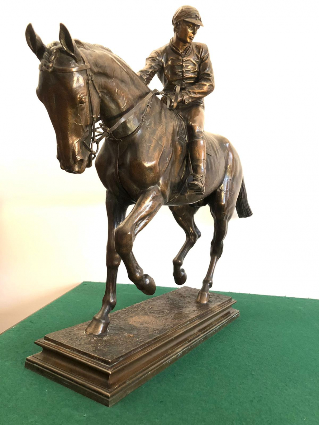 "Bronze le grand jockey d’Isidore Bonheur. Bon état hormis une tache claire sur le socle et un défaut dans l’attache à des rênes au niveau de la main Objet acquis par leg particulier du 19/10/2016"