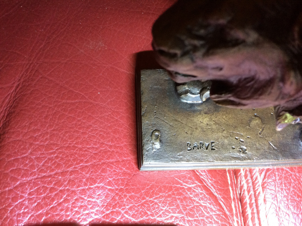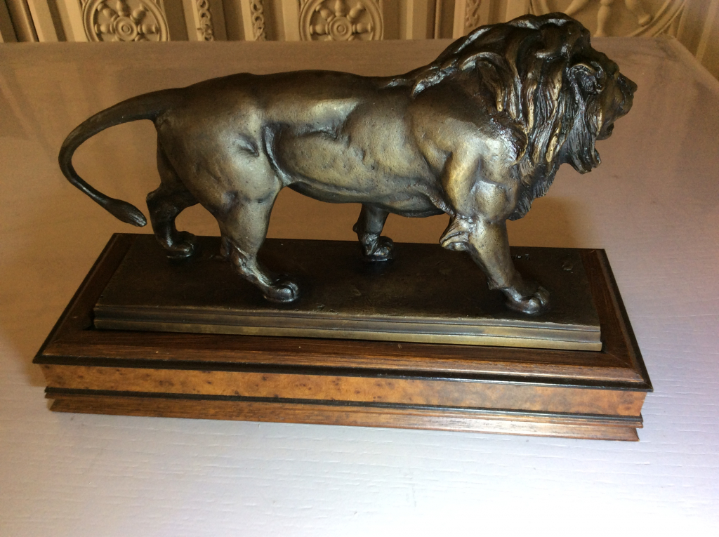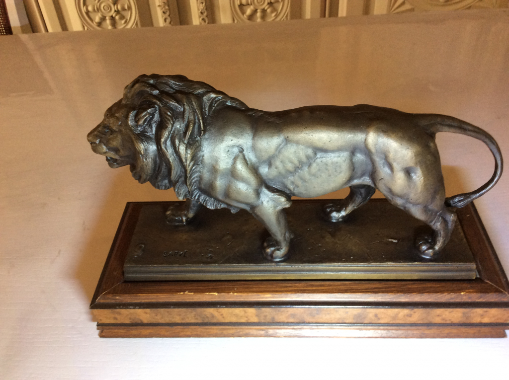"Lion sur socle solidaire signature BARYE Et une forme de La lettre C au même niveau Une Étiquette Dorée sous le socle avec Initiales V A Puis Franklin Mint Avec un Titre « LION QUI MARCHE « État Neuf Le tout posé sur socle Bois Rectangle Acquis en vide Maison Si original ou copie combien estimez vous cette sculpture Cordialement"