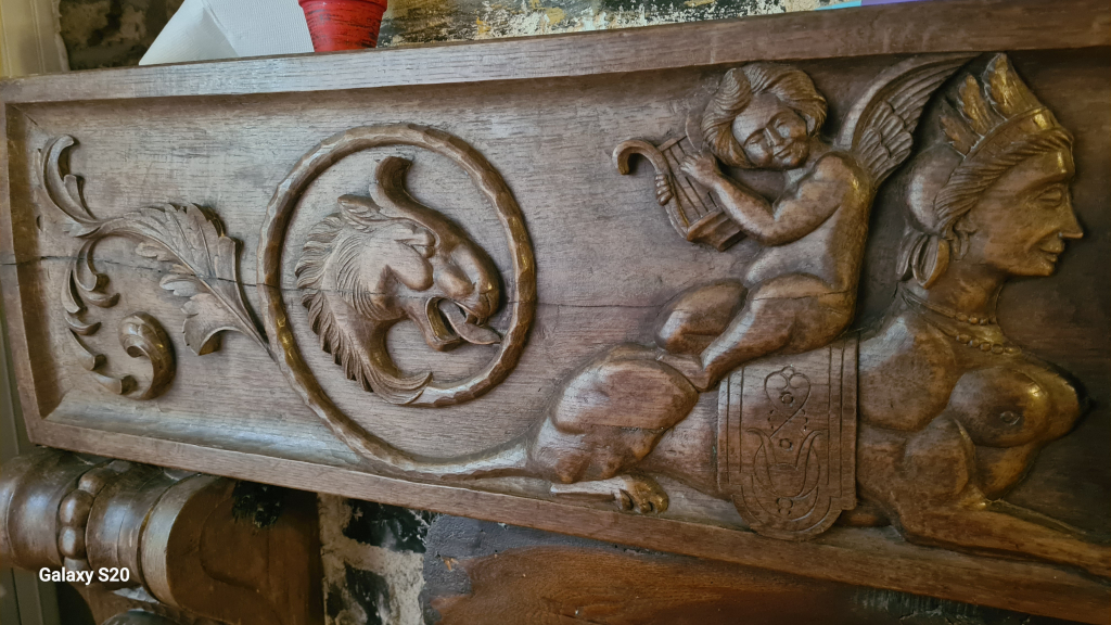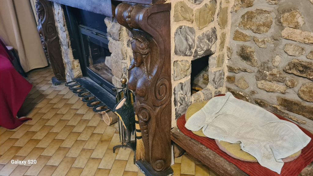 "Il s'agit d'une création du sculpteur F Brassac. Linteau et colonnes de cheminée sculptées, en chêne. Le thème est axé sur des personnages allégoriques représentant des personnages imaginaires souvent moitié humains, moitié animaux ... Le style est particulier plutôt antique . Les 3 parties ont été percées à l'arrière avec des trous très proches les uns des autres , de façon à casser le fil du bois pour empêcher les déformations dans le temps ."