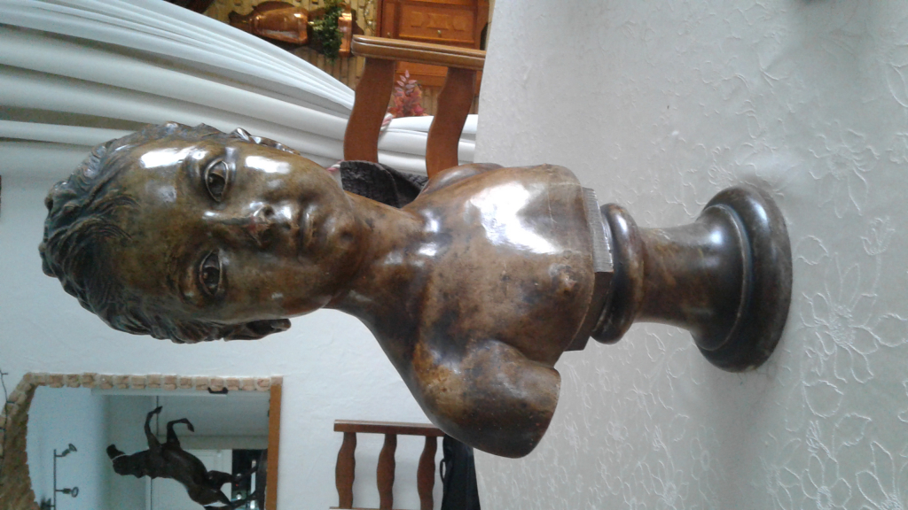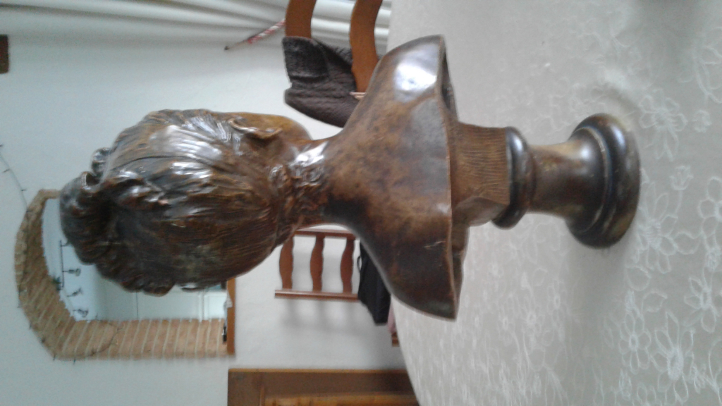 "Buste en terre cuite patinée avec une usure de patine sur le nez. Hauteur 45cm largeur 25cm deux petites griffes de 2cm sur 1/2 mm et une absence de patine dans la coiffure arrière d un 1/2 cm sur 4mm. Elle est signée d après Houdon datée 1774 où 1777. Difficile a lire.dans ma famille depuis plus de 100 ans les papiers et factures ont été perdus. Je ne les détiends pas"