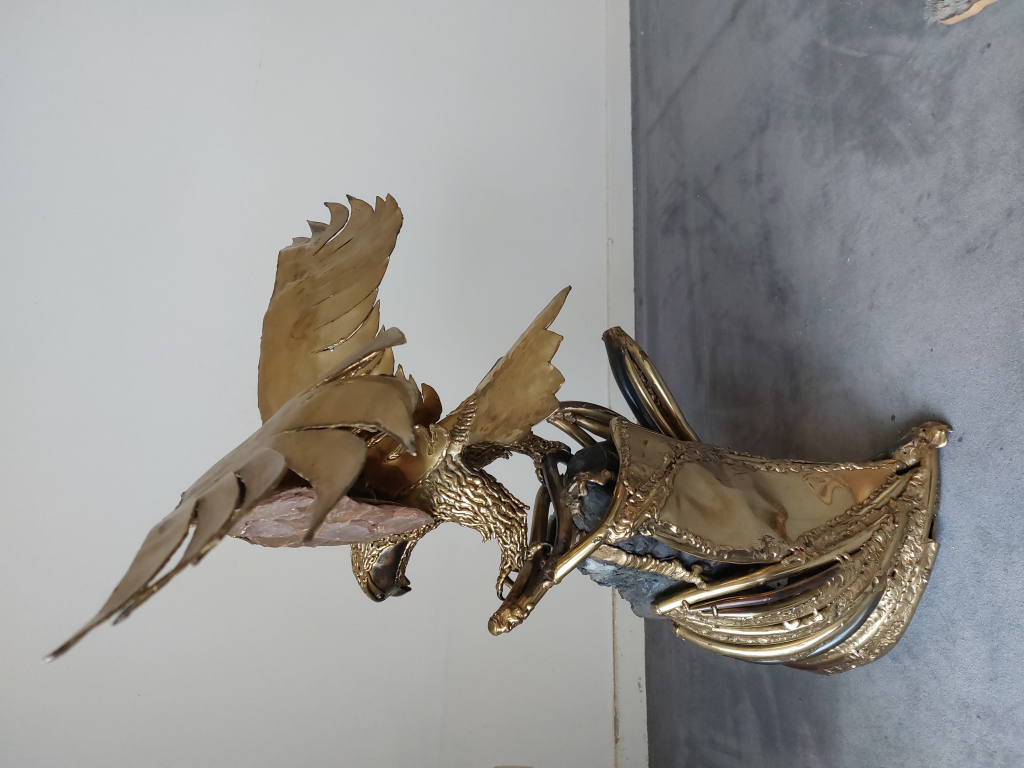 "Sculpture réalisée vers les années 1970 par Isabelle et Richard Faure ( ? , pas de signature visible ) Achetée dans le quartier des Halles à Paris Un aigle, aux ailes déployées, soulignées de feuilles de mica mauve , est posé sur un nid en laiton enserrant une énorme et magnifique géode d’améthyste L'électrification d'origine ( pouvait s'éclairer) est à refaire Facture non retrouvée"