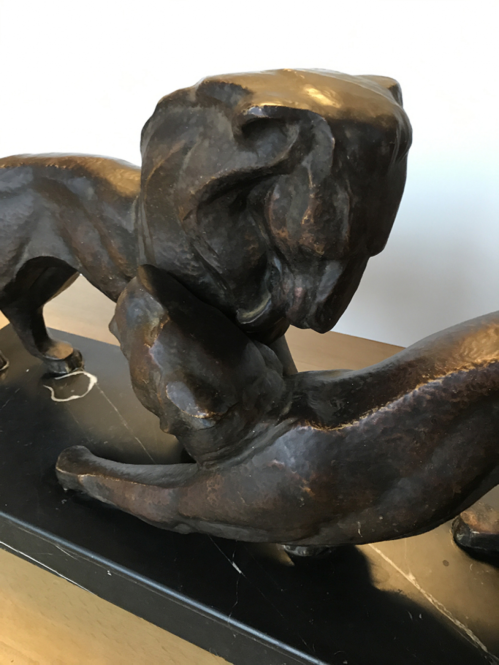 La première approche d’un professionnel du marché de l’art est visuelle. Nos équipes étudient dans un premier temps les différentes photographies de vues d’ensemble et de détails envoyées par le déposant avec sa demande : Michel DECOUX - Bronze Sculpture Bronze Lion et lionne sur socle en marbre - Art Deco Signee Michel Decoux.