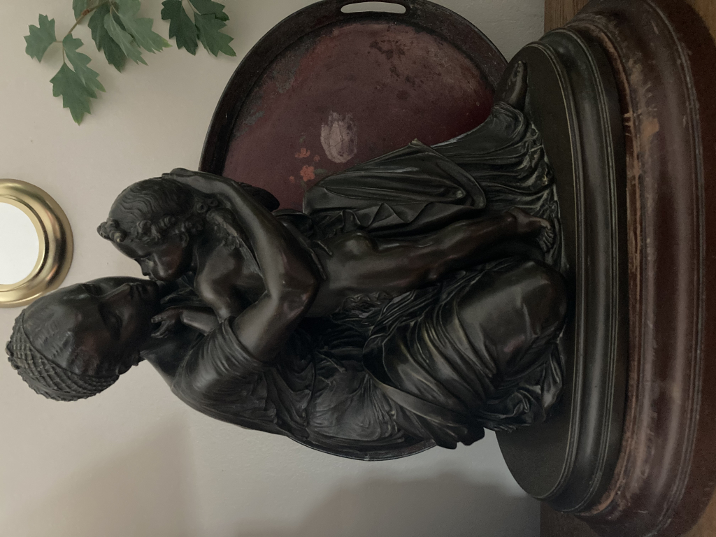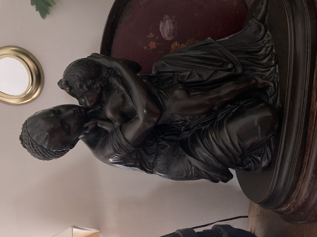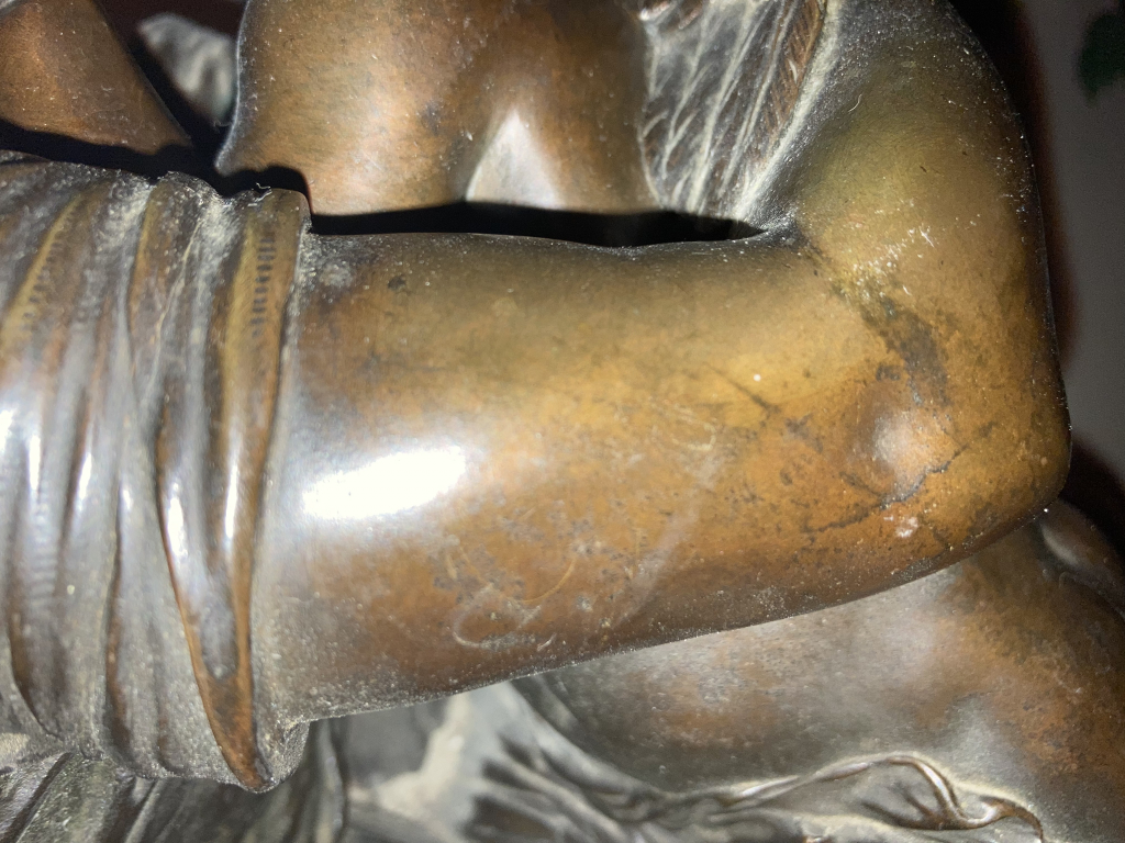 "Type Bronze sur socle en bois Le socle est abîmé -nombreux coups et rayures Une femme et un cupidon? Les mesures données sont hors socle"