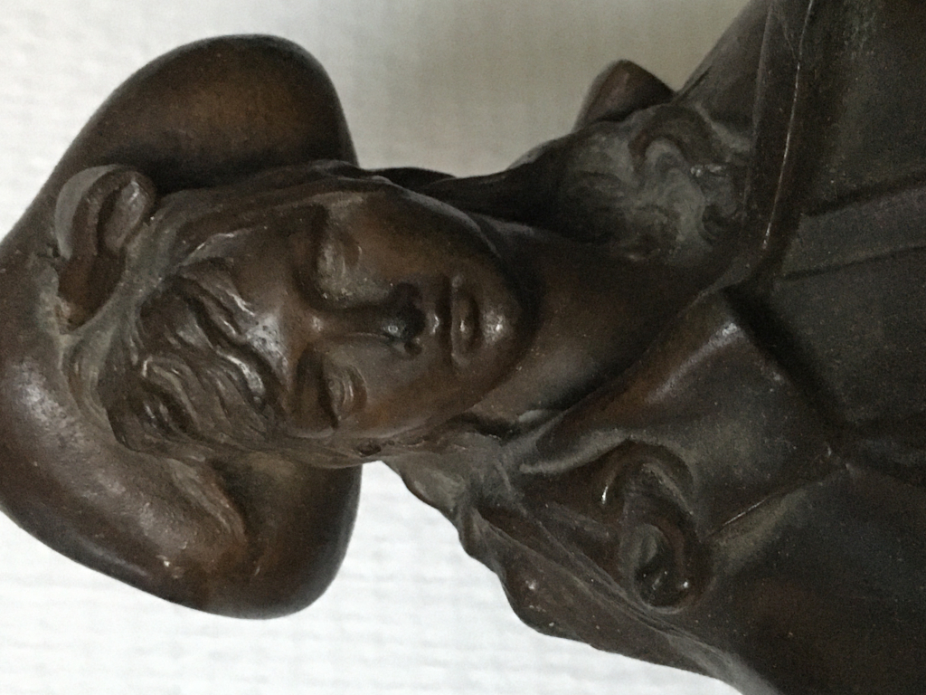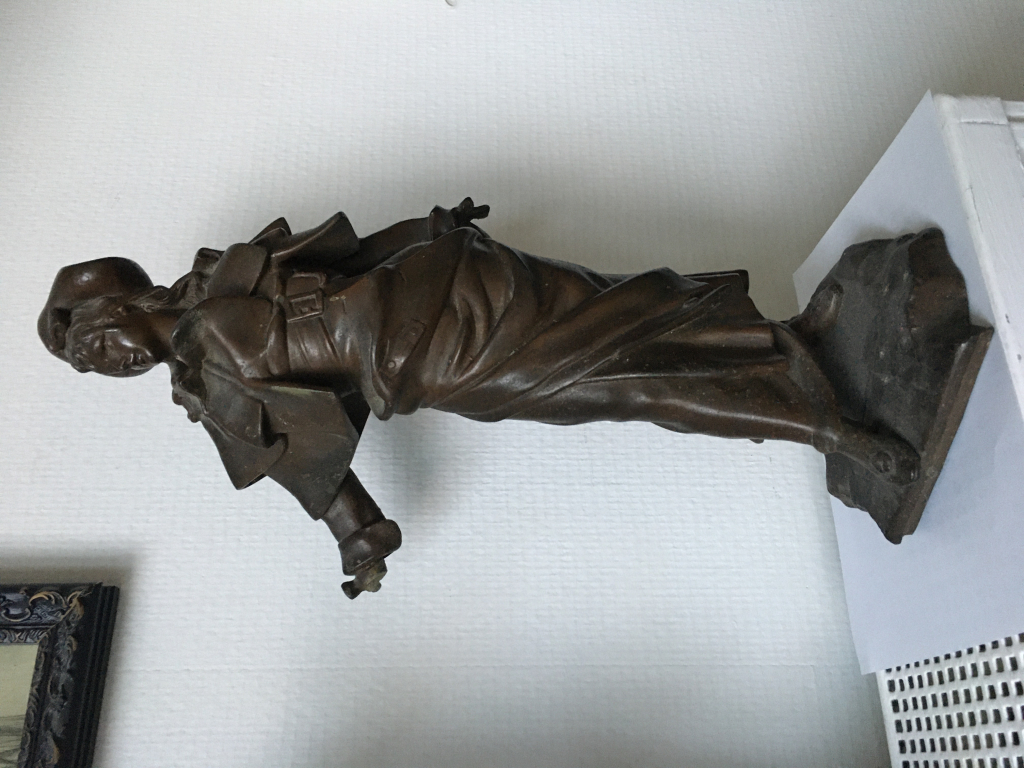 "Sculpture signée Nelson, peut-être du bronze. Il n’y a plus de socle. Il manque la main droite et le bout de la cape derrière. Elle pèse 3kg500."