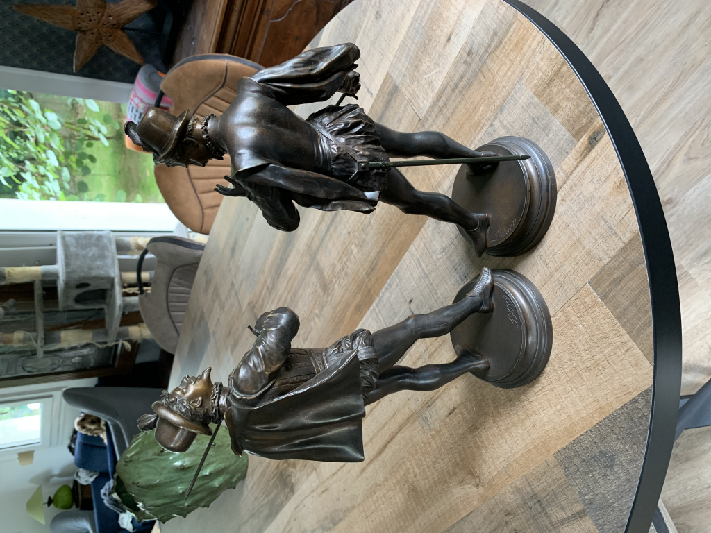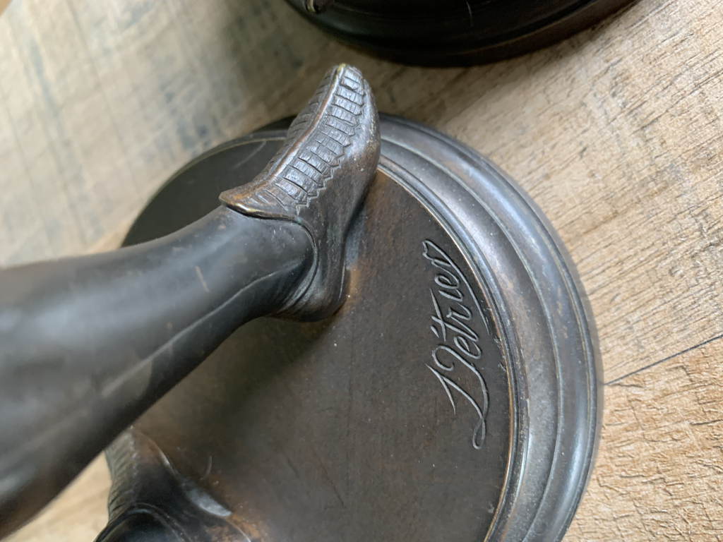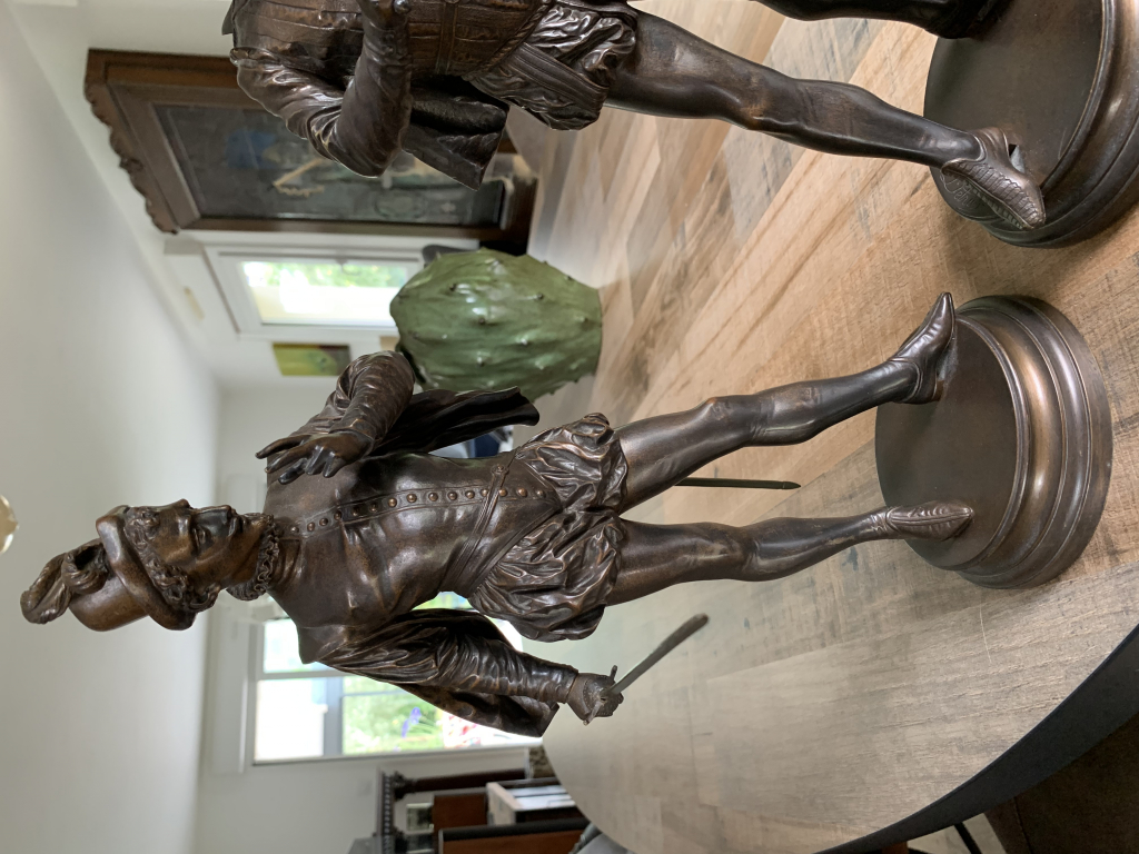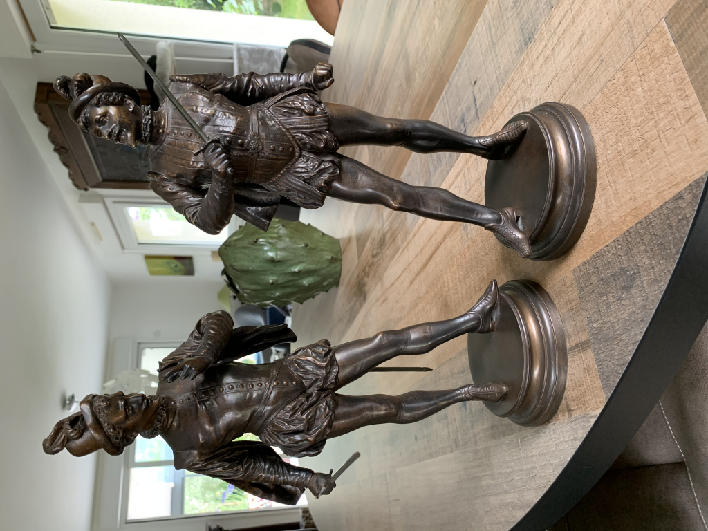 "Paire d'hommes en armes, des mousquetaires prêts au duel. Finement ciselé et patiné. Signé tout deux sur la terrasse et marqué pour le fondateur "E. TASSEL éditeur". Taille: H 37cm Ecole française de la deuxième partie du 19ème siècle. Lit: Pierre-Louis Detrier présente plusieurs bronzes au Salon de 1866 à 1896, citons "Ulysse reconnu par Pénélope" (1870), "Le caprice" (bas-relief, 1879), "Amour maternel" (1883), "Grande sœur" (1892), "Amateur Louis XVI" (1896). Le fondeur Raingo fût employé par l’artiste. fondeur Raingo fût employé par l’artiste"