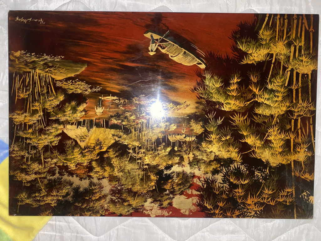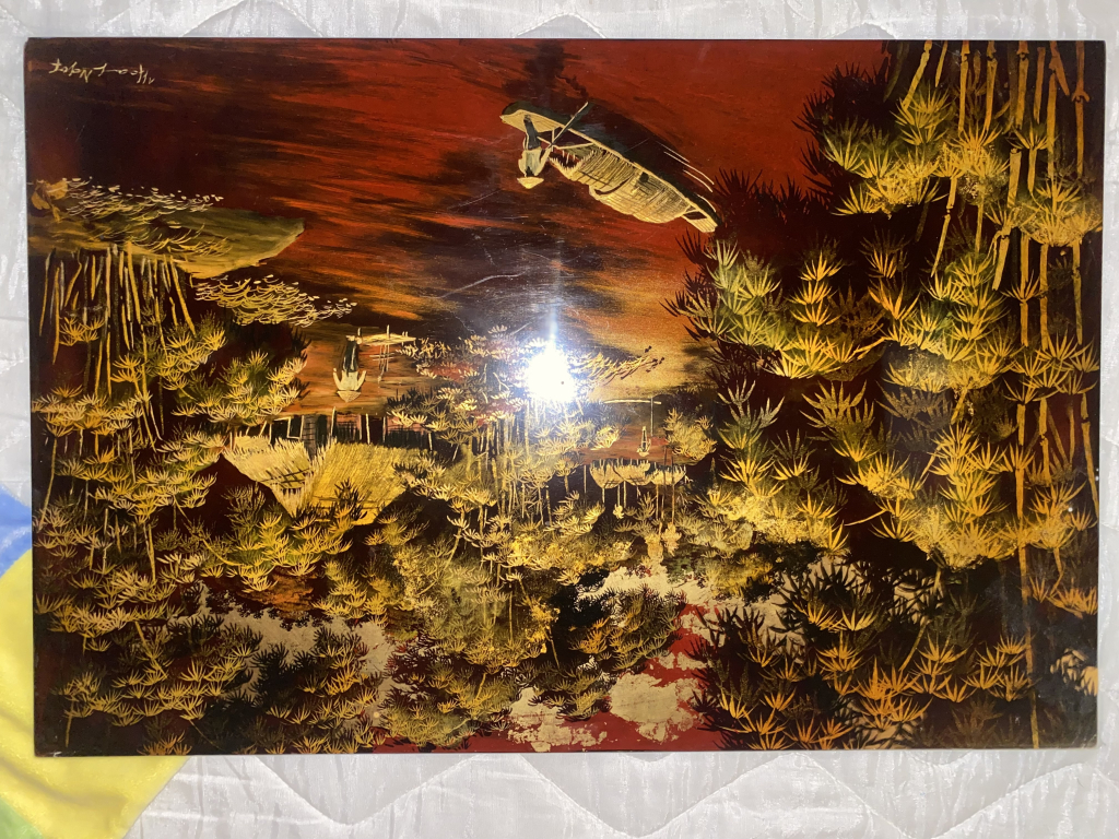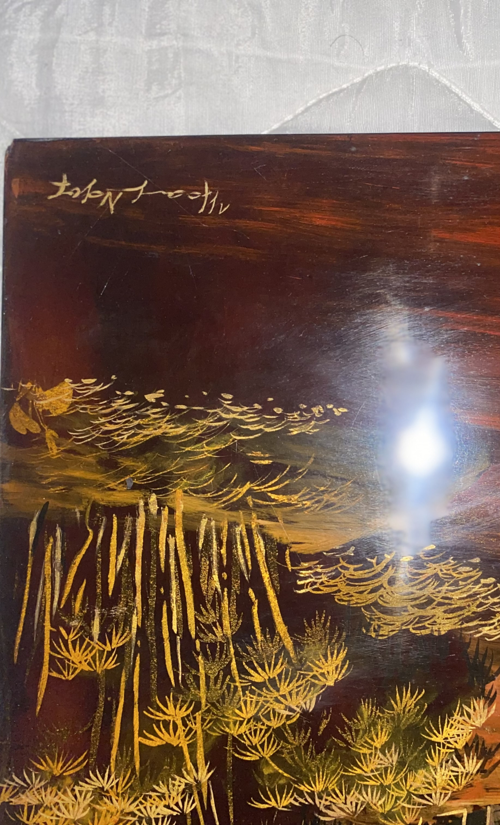 "Panneau laqué représentant une scène de paysage asiatique avec arbres, maison, et bateau. Couleurs dominantes rouge foncé, or et noir. Des reflets indiquent la présence d'un vernis brillant. L'œuvre présente des signes d'usure et quelques éclats au niveau du laquage. Signé dans un coin supérieur, la signature semble être en caractères asiatiques. Le panneau est en bon état général, malgré les marques d'âge visibles. L'objet est probablement en bois recouvert de laque traditionnelle, décoré à la feuille d'or pour les motifs. L'aspect général est celui d'un objet décoratif artisanal d'origine asiatique."