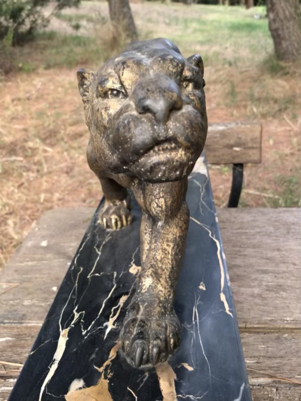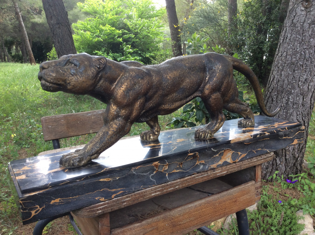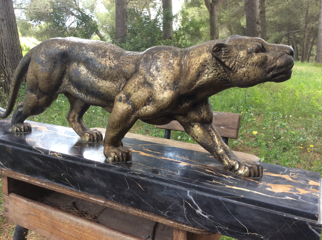 "Panthère en marche, dans la famille depuis 1960 Régule ou Bronze ? en grattant la matière, elle reste dorée et non pas blanche.....Bronze ? Patine usée Socle en marbre noir en bon état, aucun "accident" Cependant un côté du socle est un peu blanchi par une exposition à la chaleur d'une cheminée sur laquelle l'objet était exposée"