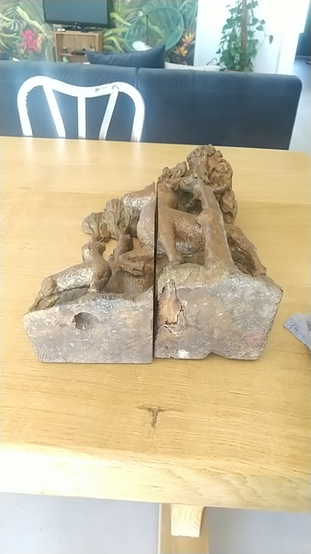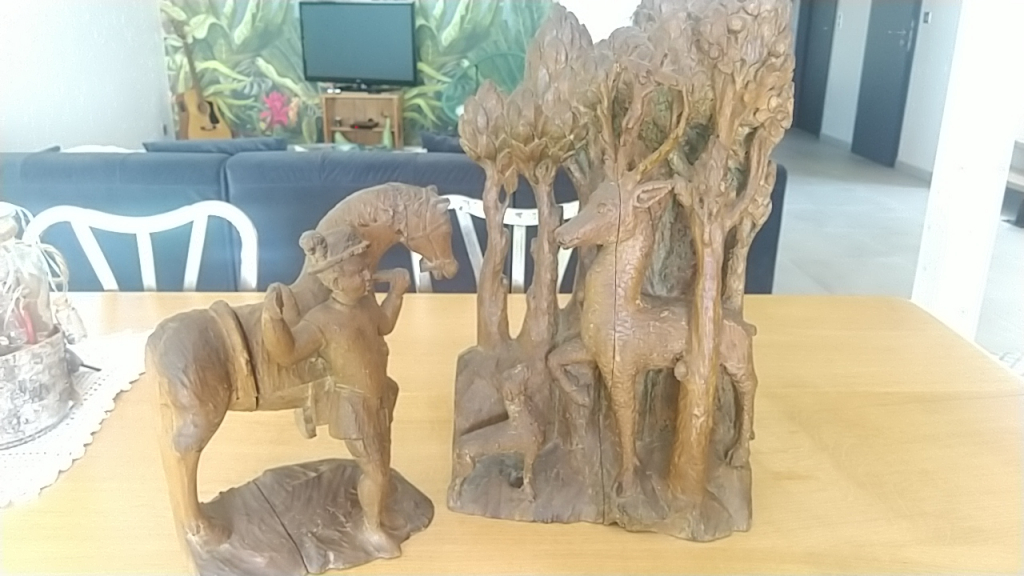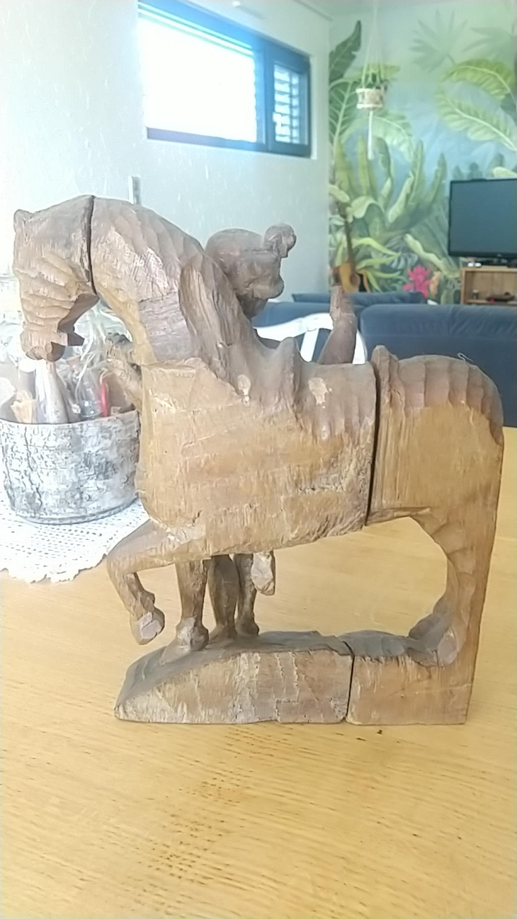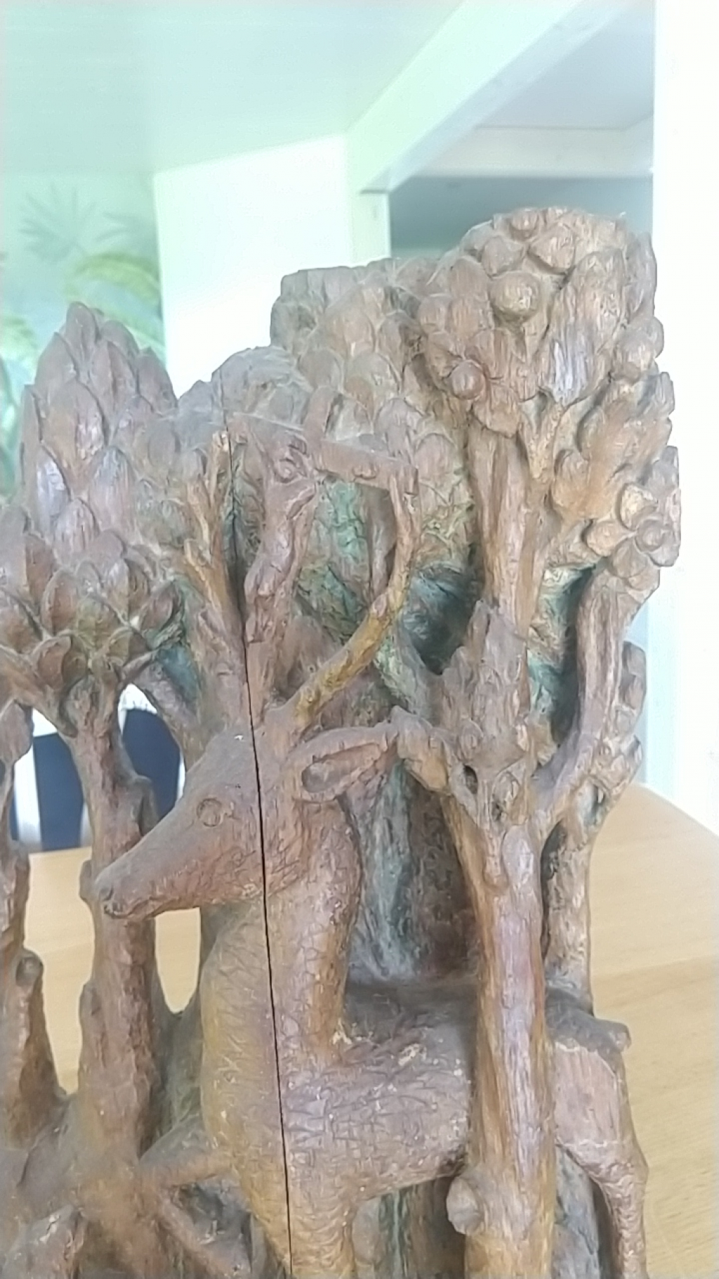 "Statuette bois du 13eme siècle, représentant la passion de St Hubert. Il manque une partie de la main du personnage."