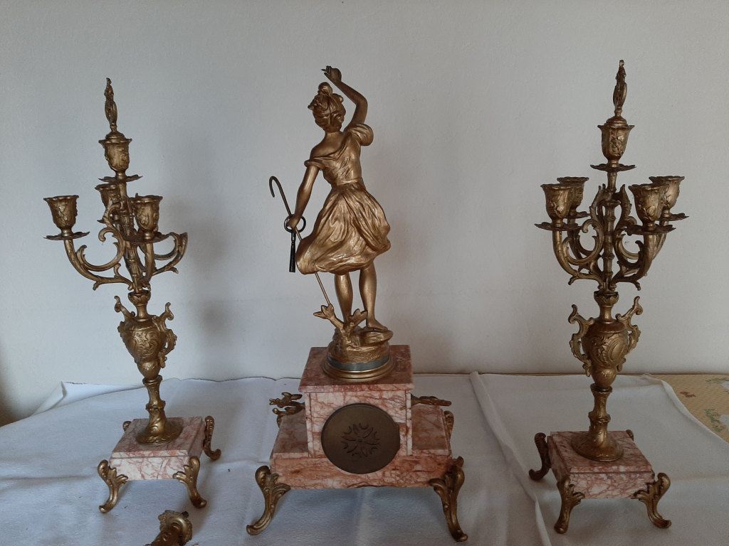 "Une pendule femme sur Le Mont et deux chandeliers (une branche cassée)"
