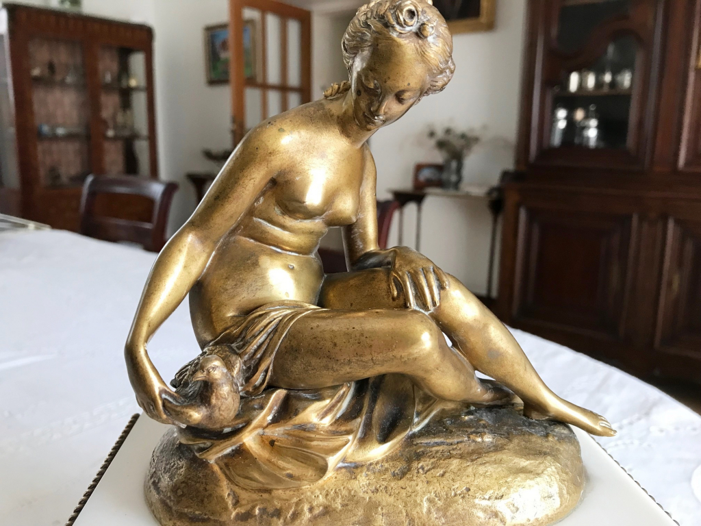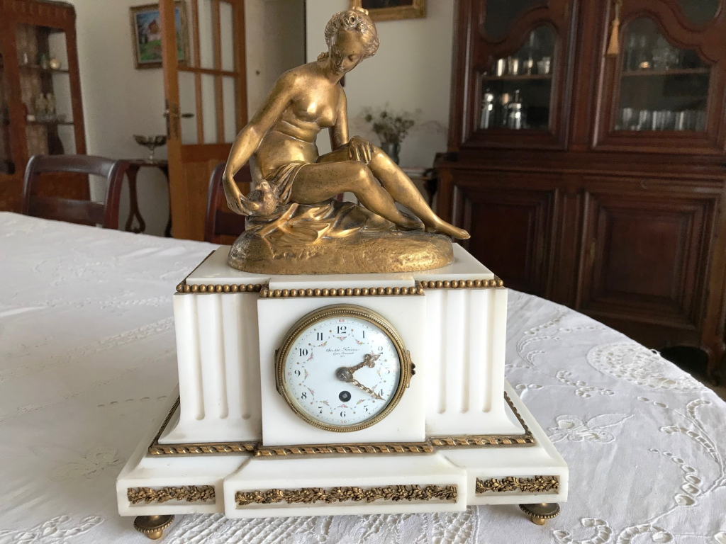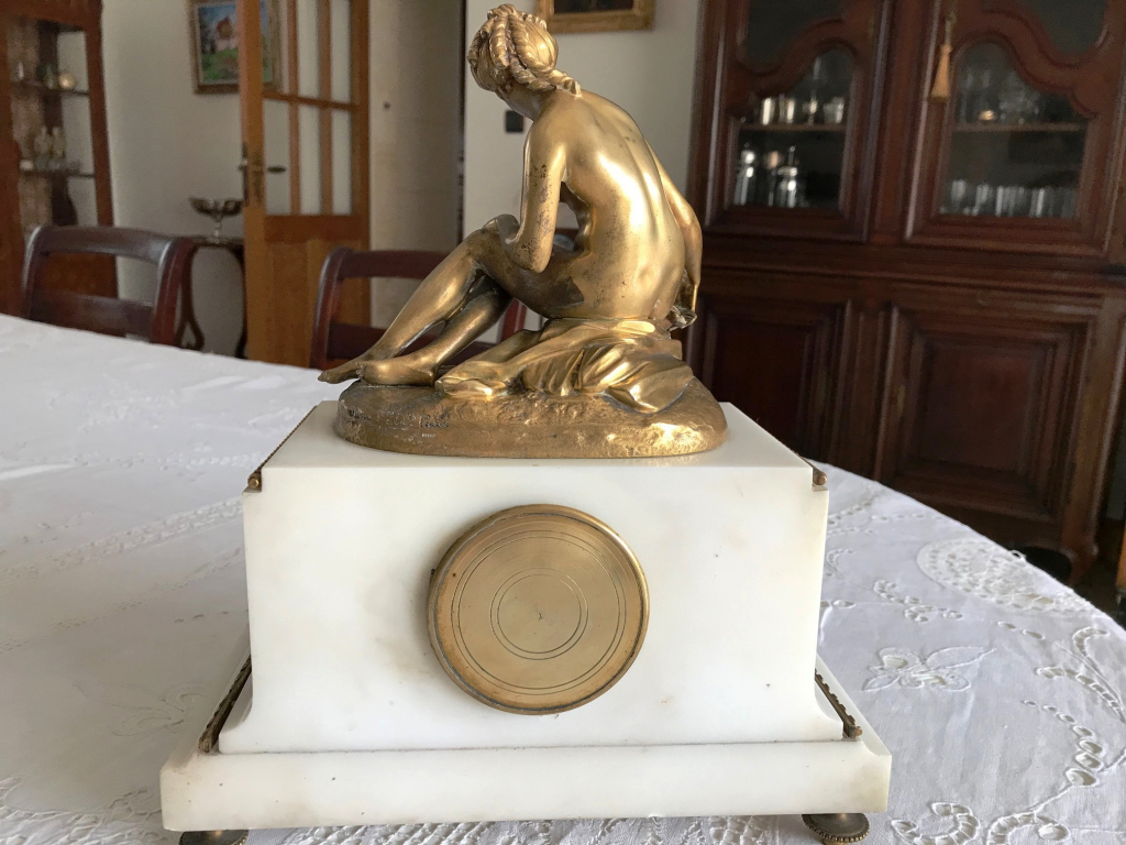 "Pendule fabriquée par Susse Frères constituée d'un socle en marbre et d'un bronze doré signé "Falconet". La sculpture est celle d'une femme tenant dans sa main droite une colombe. Sur la base du bronze, il est gravé "Susse F. Ed. Paris - Bronze". Le cadran de l'horloge est d'un diamètre de 8 cm et le verre de protection est bombé. Le mécanisme d'horloge est sans sonnerie. Sur le cadran, il est écrit "Susse Frères - Hors concours - 1900". L'ensemble est en très bon état."
