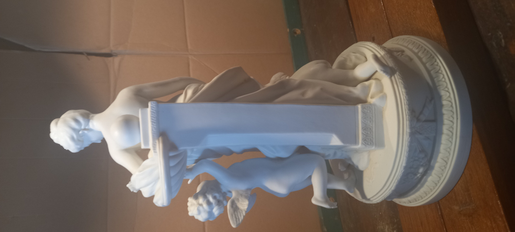 "Hauteur 33cm diamètre socle 15,5cm. Manque sur une aile d'un ange ainsi que quelques doigts de la femme.j' aurais souhaité connaître la provenance, la datation ainsi que l' estimation. Merci pour votre réponse ."