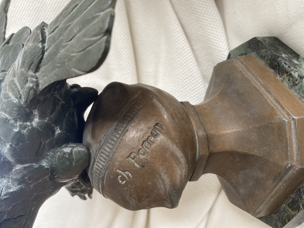 "Sculpture du 19 E à l aigle sur globe en métal patiné signé Charles Perron"