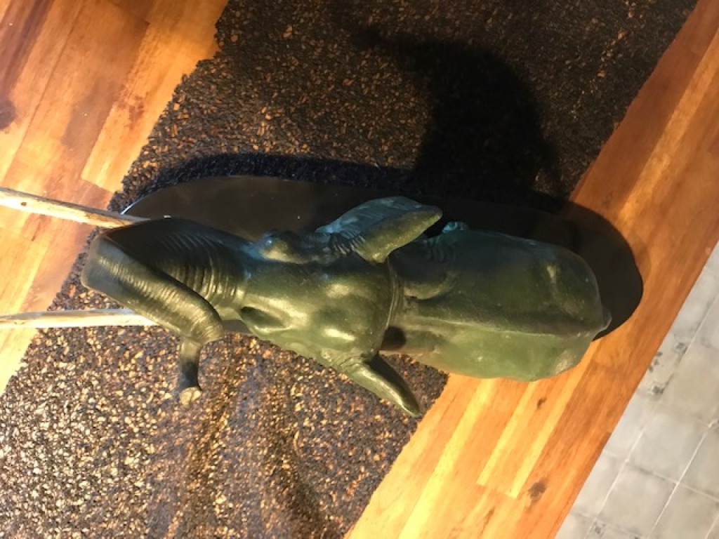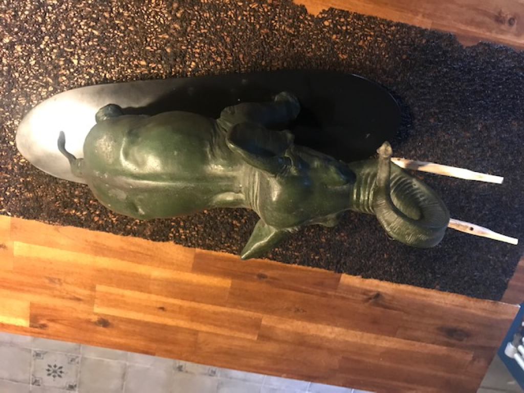 "Epreuve en régule à patine verte figurant un éléphant d'Afrique reposant sur une base ovale en marbre noir. Signée sur la base "Rochard". H : 36 cm L : 58 cm P : 16,5 cm Il manque les défenses, remplacées par du bois. La base en marbre noir est partiellement rayé sur la tranche, avec de petits impacts sur le dessus. La patine est moyenne. Œuvre de 1930. https://www.1stdibs.com/furniture/decorative-objects/sculptures/animal-sculptures/art-deco-elephant-sculpture-regule-on-black-marble-socle-france-1930s/id-f_10014383/"