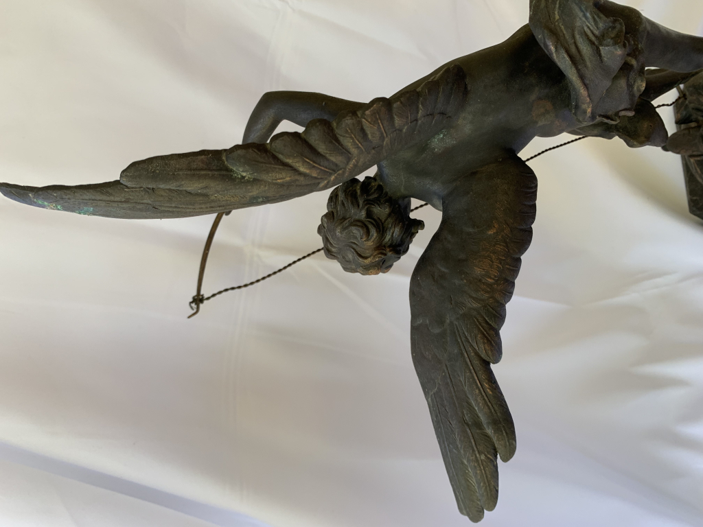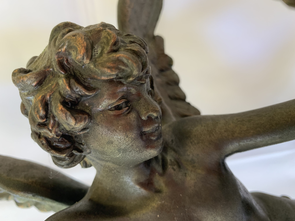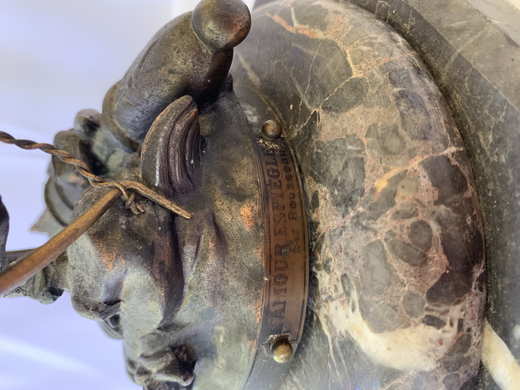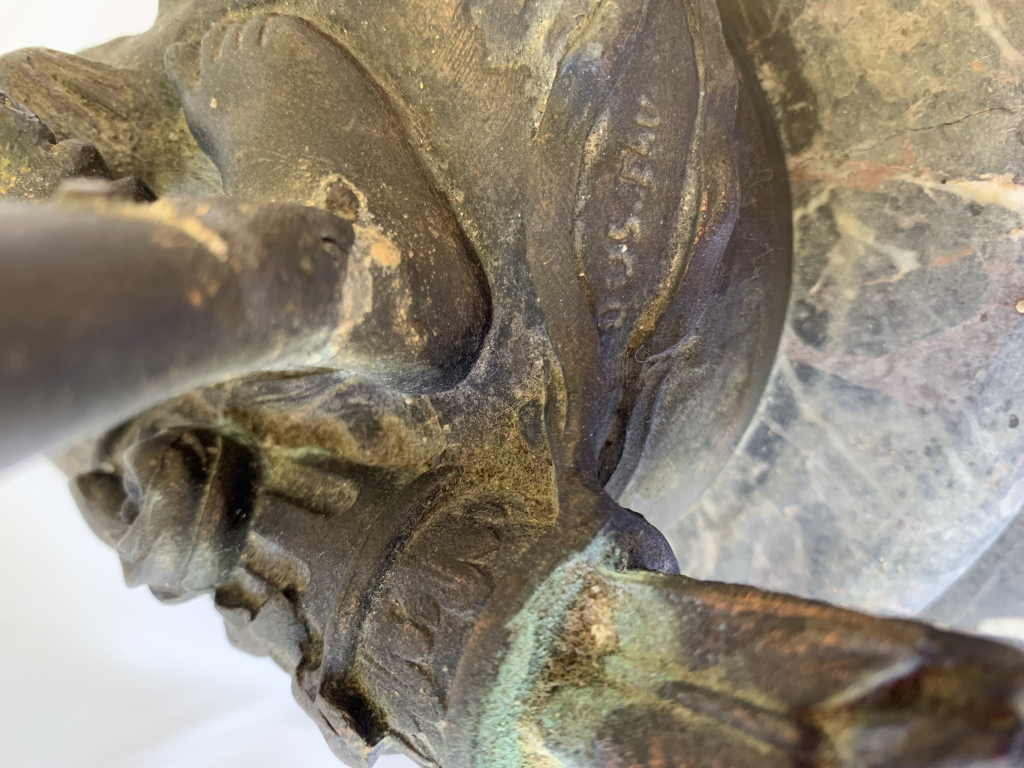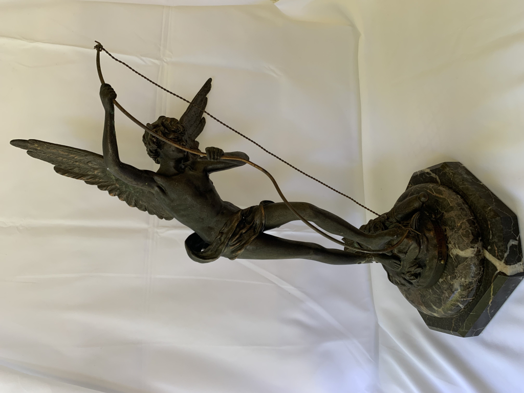 "Statue en bronze représentant un archer , Cupidon, sur socle biseauté en marbre. Dimensions : 53 cm x 18 cm Sur le pied une réparation ,visiblement en bon état. Devant il est écrit « l’amour espiègle Rousseau. Au dos gravé ROUSSEAU Merci pour l’estimation"