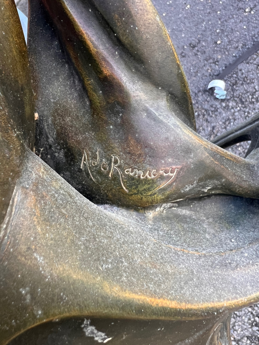 "Sculpture anciennement horloge , environ 60 cm de haut plutôt lourde avec des signe d’oxydation mais une jolie patine par endroit signée Ade Ranieri"