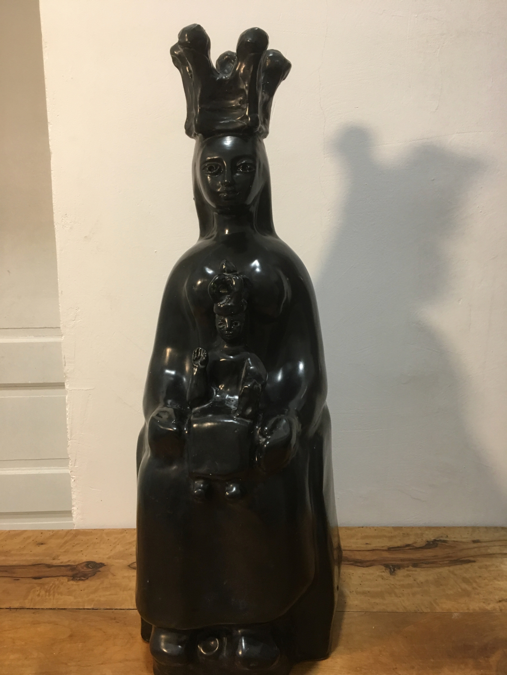 "Sculpture céramique émail noir de Georges Jouve, en parfait état. Représentant une vierge et son enfant."