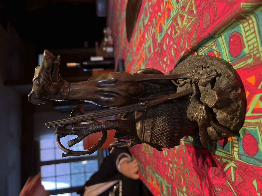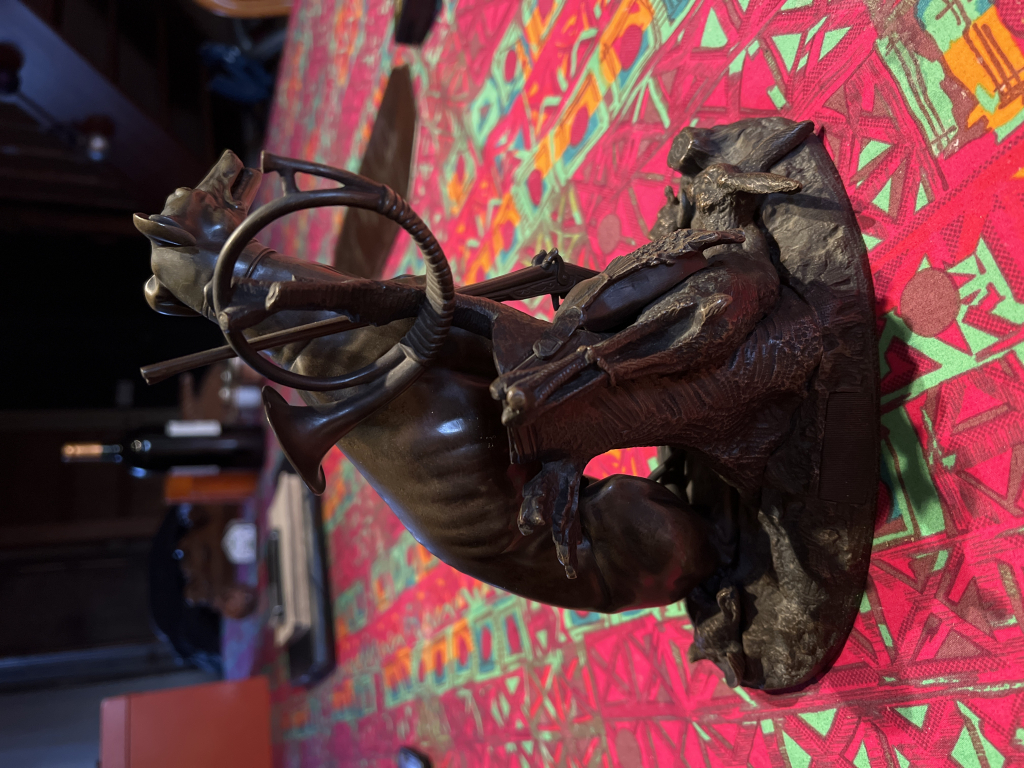"Sculpture chien en bronze signé Leblanc dessous avec socle et avec un sac, une arme une « trompette » sa bouche peut s’ouvrir. Il y a un lapin et des oiseaux mort au sol. Couleur bronze noir. Chien de chasse maigre."