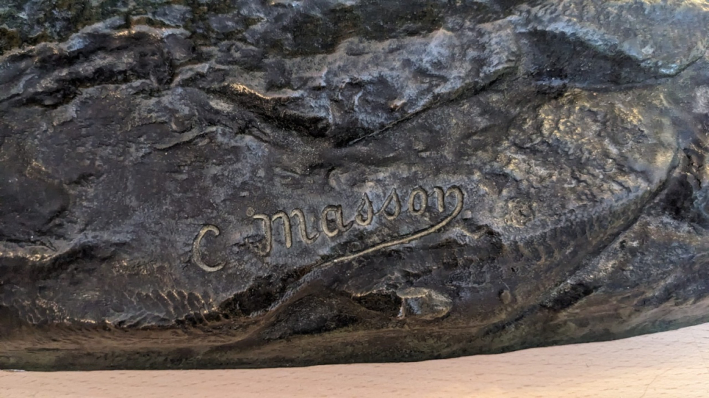 "Sculpture représentant deux cerfs en combat, en bronze. La sculpture est signée 'C. Masson'. La patine est sombre avec des nuances légèrement verdâtres caractéristiques du bronze ancien. La sculpture est très détaillée, on distingue nettement la texture de la fourrure, les muscles des cerfs ainsi que leurs bois finement ciselés. L'œuvre est posée sur une base ovale évoquant un sol naturel avec des reliefs et des détails naturels. L'état général semble bon sans dommages visibles, malgré quelques traces d'âge normales pour un bronze."