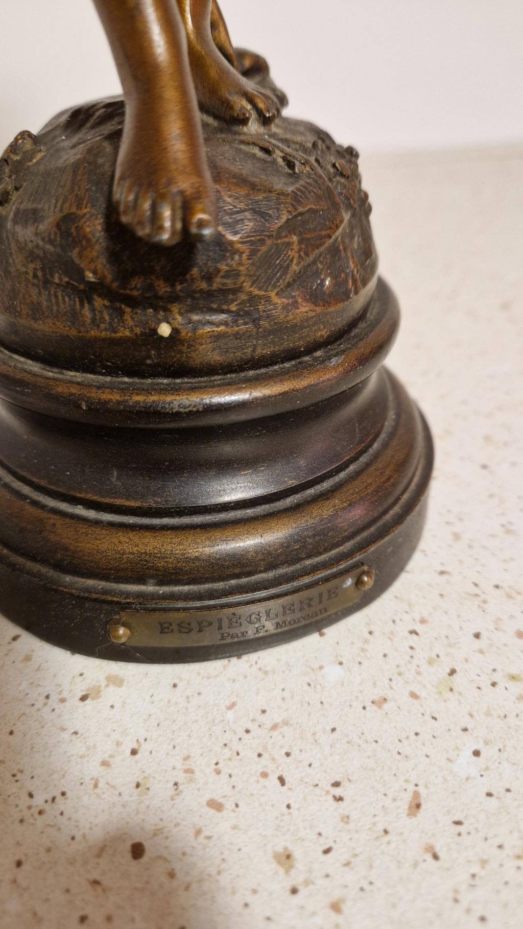 La première approche d’un professionnel du marché de l’art est visuelle. Nos équipes étudient dans un premier temps les différentes photographies de vues d’ensemble et de détails envoyées par le déposant avec sa demande : Sculpture en bronze 'Espièglerie' par F. Moreau.