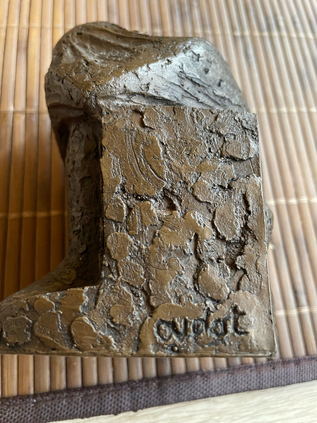 "Sculpture en bronze montrant une personne accroupie avec les bras repliés sur les genoux, la tête légèrement baissée. La texture est rugueuse, avec des détails comme les plis du corps et la base. Le bronze a une patine sombre et ancienne, avec des marques d'oxydation naturelles. La signature 'cuvilot' est visible sur un côté, et il y a une inscription au-dessous avec '54/760'. L'objet est en bon état apparent sans cassure ni déformation visible. Les pieds sont bien formés et la sculpture s'appuie sur une base irrégulière, également en bronze."