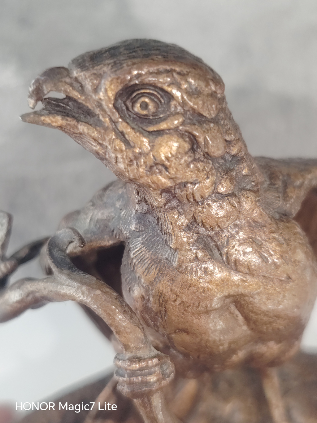 "Sculpture en bronze représentant un oiseau de proie posé sur un rocher, signée sur la terrasse J. Moigniez. Patine brun-jaune doré, chaude et nuancée, très bien conservée. Ciselure fine et détails précis du plumage. Socle en marbre veiné fixé par vis ancienne. État : très bon état général, usures légères de patine liées à l’âge. Poids : 1,420 kg"