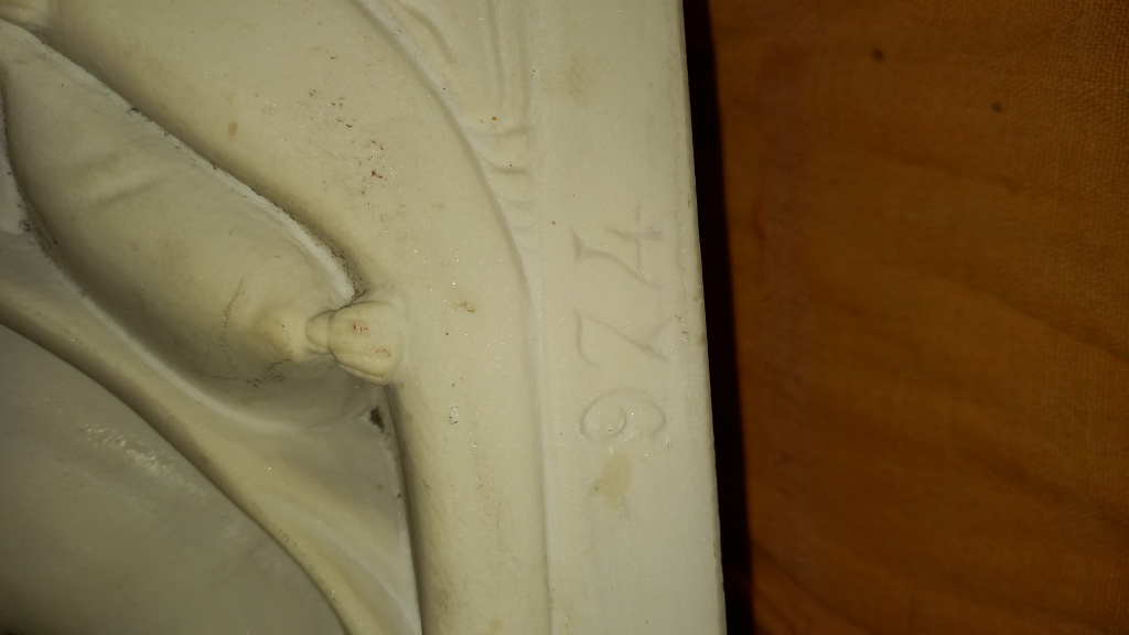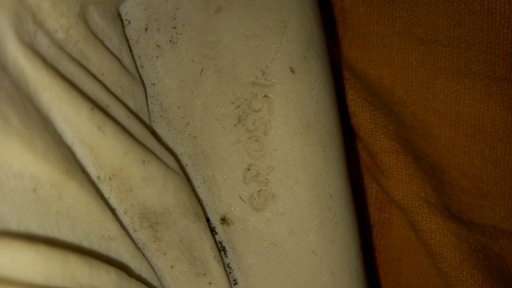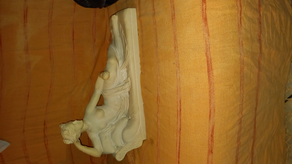 "Bonjour c est une sculpture d une femme qui mange une pomme allongée sur un canapé signé grossi derrière et le numéro 974 devant ."