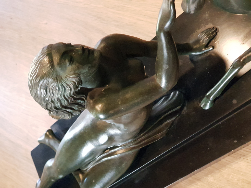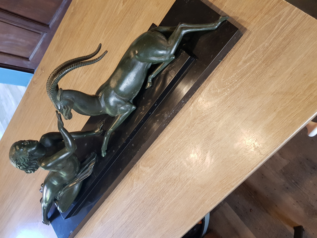 "sculpture d' époque ART DECO : " SEDUCTION " signée FAYRAL - sujets en fonte d' art ( variété de régule de qualité supèrieure ) à patine vert antique/bronze - sur base élaborée en marbre massif noir belge. Une oeuvre mythique - en édition ancienne d' époque ART DECO - circa 1925 : on ne se lasse pas d' admirer cette sublime nymphe nue, au visage ravissant et corps splendide à la si belle chute de reins - en pleine séduction de son Dieu représenté sous l' apparence de cette majestueuse antilope. Une qualité de ciselure magistrale propre à cet artiste incontesté et internationalement renommé, pour une patine précieuse et raffinée. Une scène délicieuse à la présence d' une élégance extrême, d' une grande exceptionnelle beauté. A ne certes laisser s' enfuir sous aucun prétexte : une création extraordinaire d' époque, de plus en plus difficile à trouver. Signé: FAYRAL dans le métal - fonte ancienne - édition d' époque ART DECO - 1920/1930 - NO COPY. En parfait état - quelques usures de patine usuelles et micro-éclats dans le marbre habituels pour une édition ancienne, pour les ultra-puristes. Cette oeuvre est référencée au Catalogue MAX LE VERRIER des Années 30 : " SEDUCTION " - N° 996. Voir également " ART DECO - Encyclopédie des ARTS DECORATIFS des années vingt et trente " par Alistair Duncan - CITADELLE - Mazenod éditeur. FAYRAL : pseudonyme de PIERRE LE FAGAYS : 1892/1962 - trés célèbre et renommé sculpteur français de la pèriode ART DECO né à Nantes. Médaille d' Honneur en 1927. Meilleur ami de MAX LE VERRIER qui édita la plupart de ses oeuvres. Travailla le régule, le bronze et plus rarement la terre cuite. DIMENSIONS: -longueur: 68 cm. -largeur: 15 cm. -hauteur: 24 cm. -poids: 15 kg."