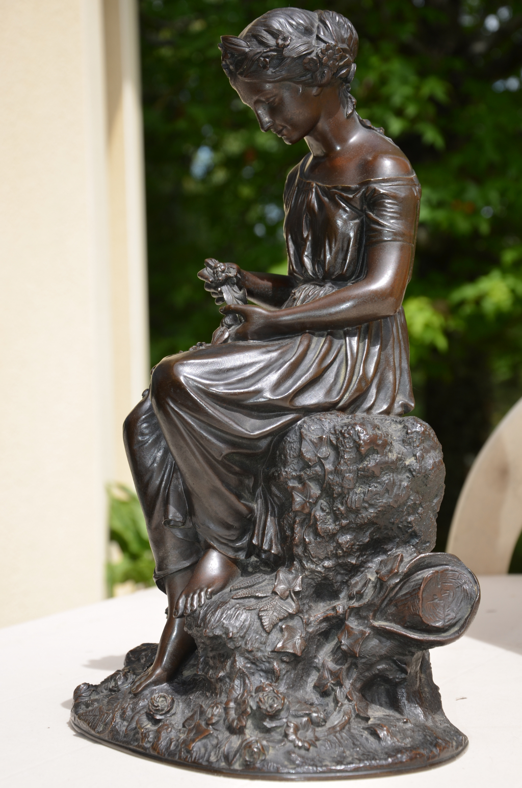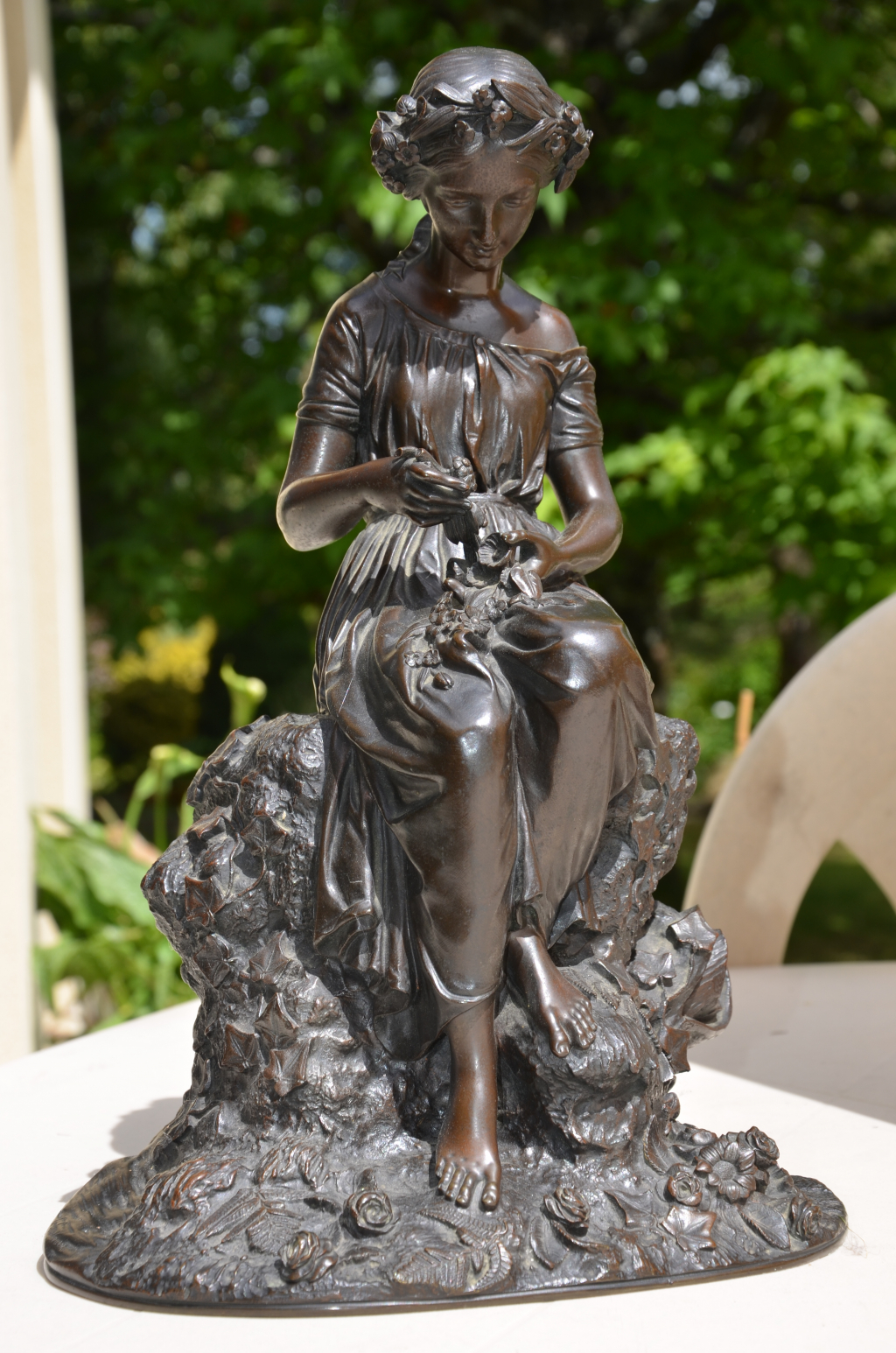 "statue représentant une jeune fille assise sur un rocher, tenant des branches de fleurs dans ses mains signature de l'artiste sur le côté"