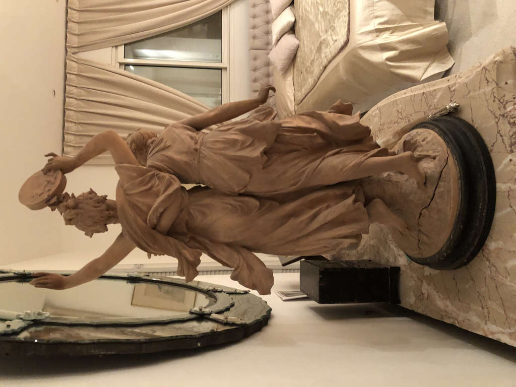 "Grande statue avec socle de 93 cm au plus haut - 2 femmes dont une avec tambourin et petit enfant. Fissure sur le bas à l’arrière (cf photo). Signature L.Grégoire"