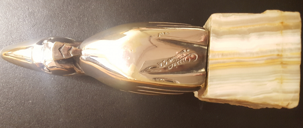 La première approche d’un professionnel du marché de l’art est visuelle. Nos équipes étudient dans un premier temps les différentes photographies de vues d’ensemble et de détails envoyées par le déposant avec sa demande : Serre livres bronze patine argent sur socle marbre.