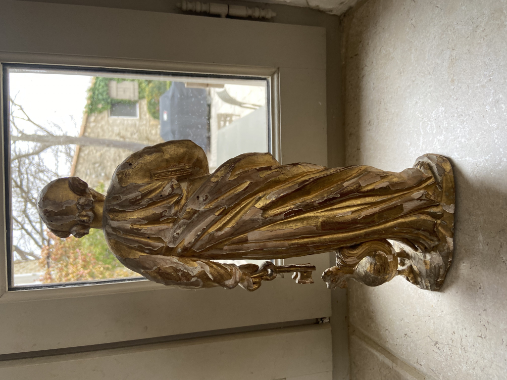 La première approche d’un professionnel du marché de l’art est visuelle. Nos équipes étudient dans un premier temps les différentes photographies de vues d’ensemble et de détails envoyées par le déposant avec sa demande : Statue bois et doré représentant Saint Pierre.