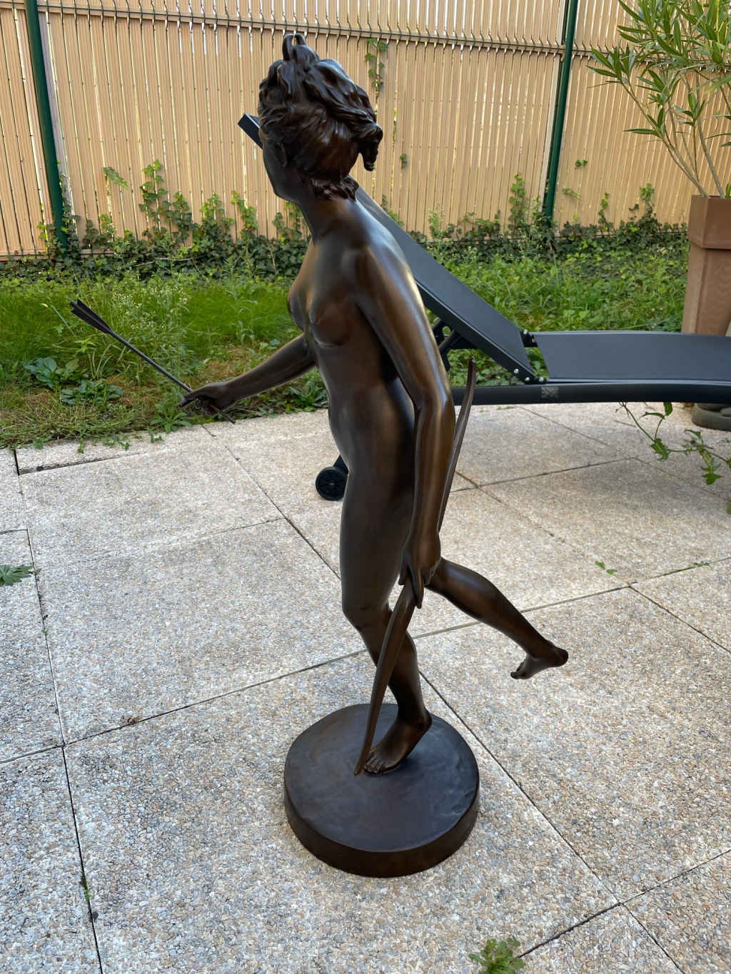 "Statue "Diane la Chasseresse", très bon état, en bronze, signée de Houdon, F.Barbedienne, Fondeur Paris, n°677, datée du 4 juin 1889, dimension 80cm de hauteur, 60 cm de long et 50 cm de large. Le bout de sa flèche est cassée. Egalement frappée d'un écusson."