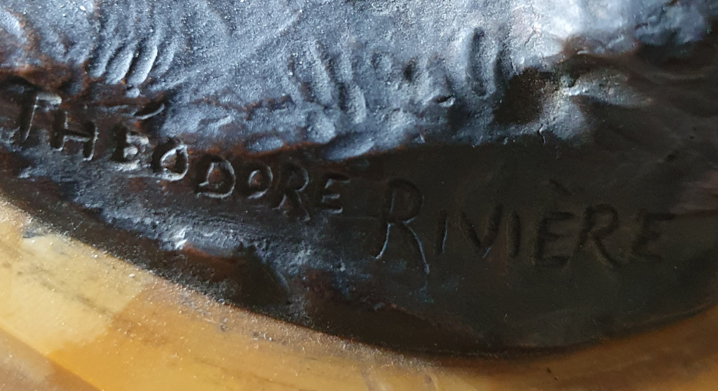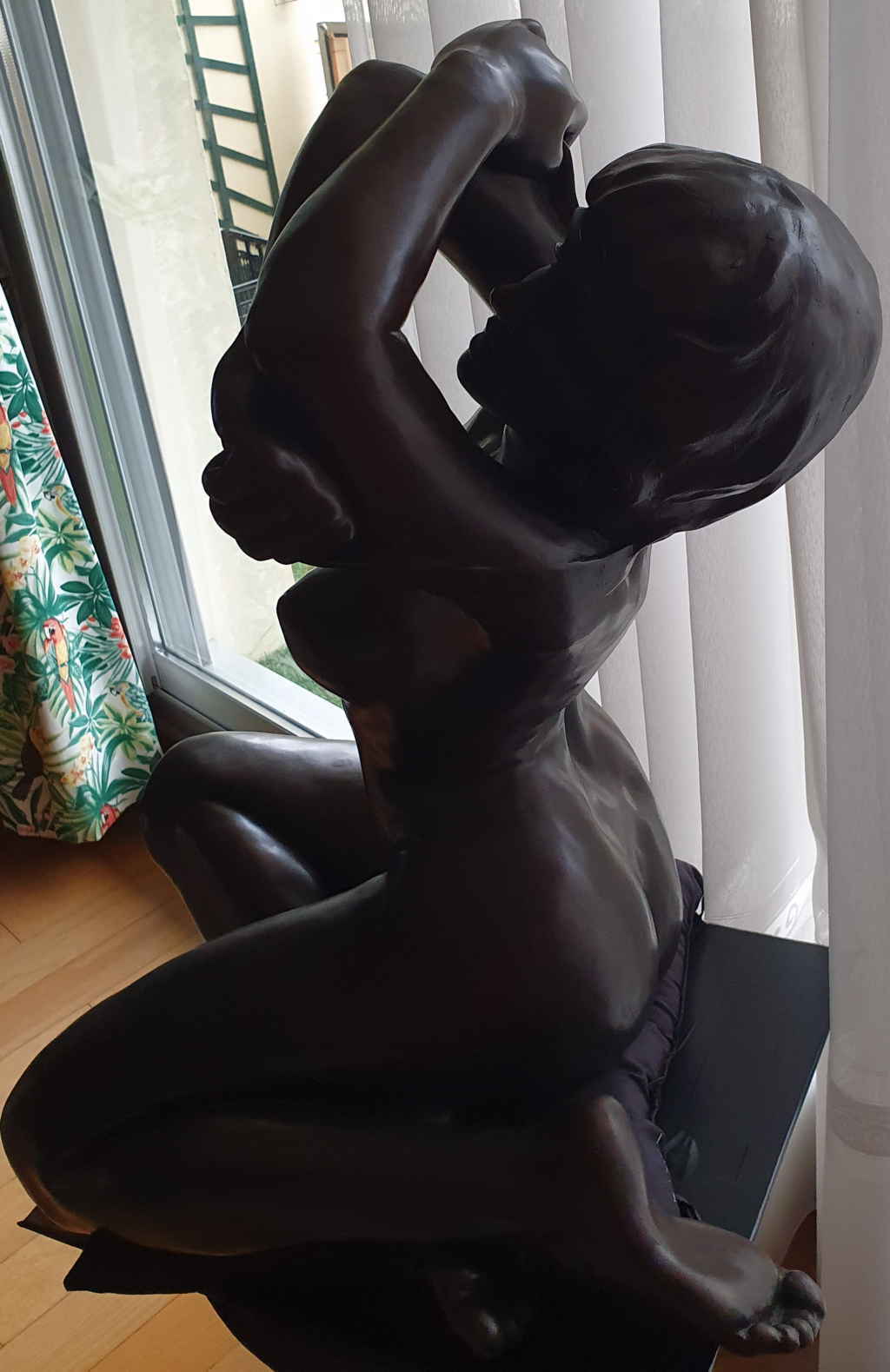 "Une statue en bronze d'une femme entrain d'enlever son tee-shirt, je n'arrive pas à déchiffrer la signature, c'est derrière et elle est lourde à retourner. Cordialement"
