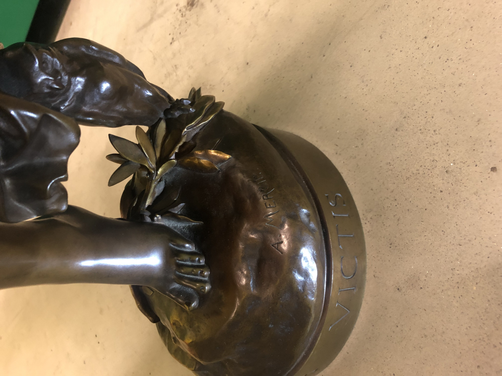 "Bronze représentant la sculpture d'Antonin Mercier Inscription sur le socle :"Gloria Victis" Au dos : bronze mécanique Barbedienne fondeur Hauteur au niveau de la tète :80 cm, Hauteur totale 107 poids 47.5kg"