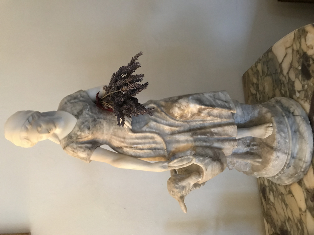 "Statue bergère provençale portant un seau avec son mouton signée PUGI Socle de 74 cm Poids conséquent (difficilement portable par une personne seule) Une oreille du mouton réparée"