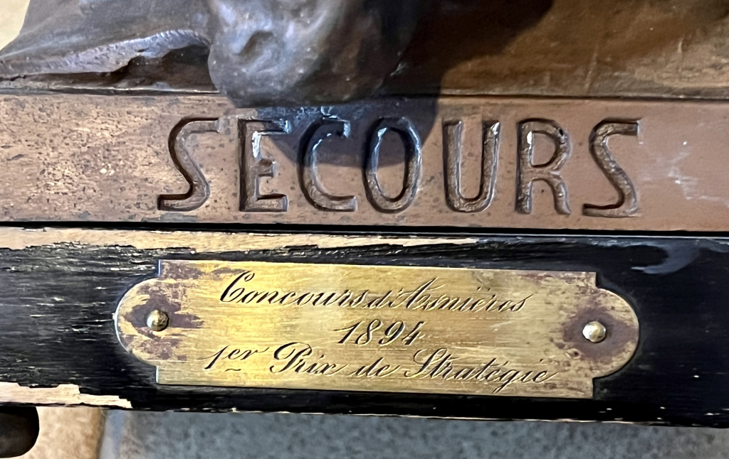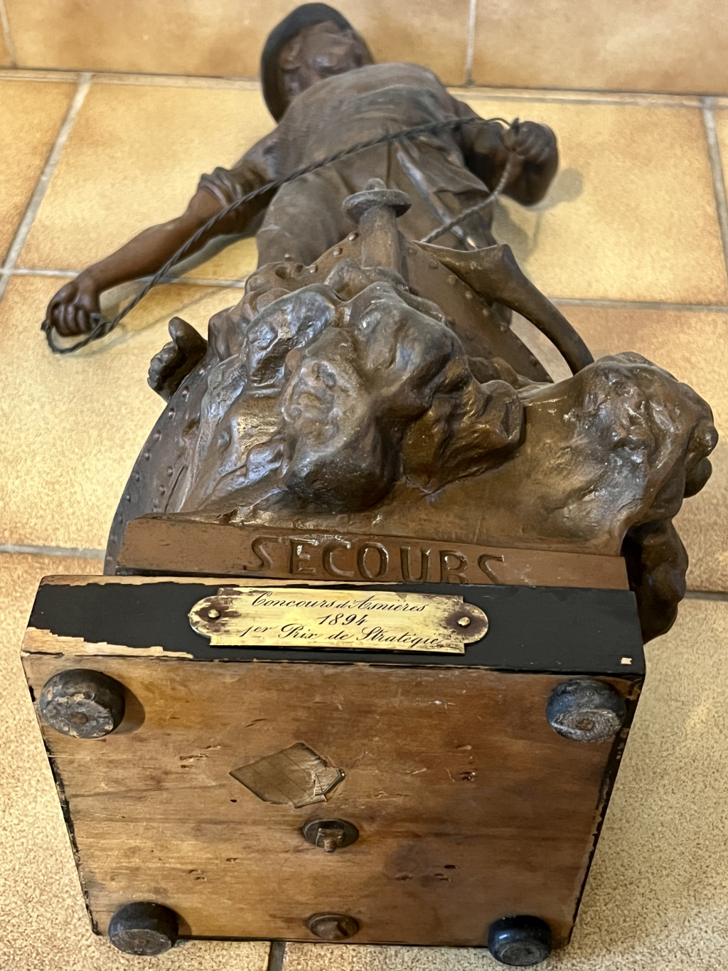 "Statue en bronze ou laiton représentant un sauveteur en mer portant un casque et lançant une corde, juché sur un canot portant une ancre. Gravure « SECOURS » sur le devant, signé WAAGEN derrière, monté sur socle en bois avec plaque « Concours d’Asnieres 1894 1er Prix de Stratégie » Hauteur 58 cm socle 170 x 165 mm"