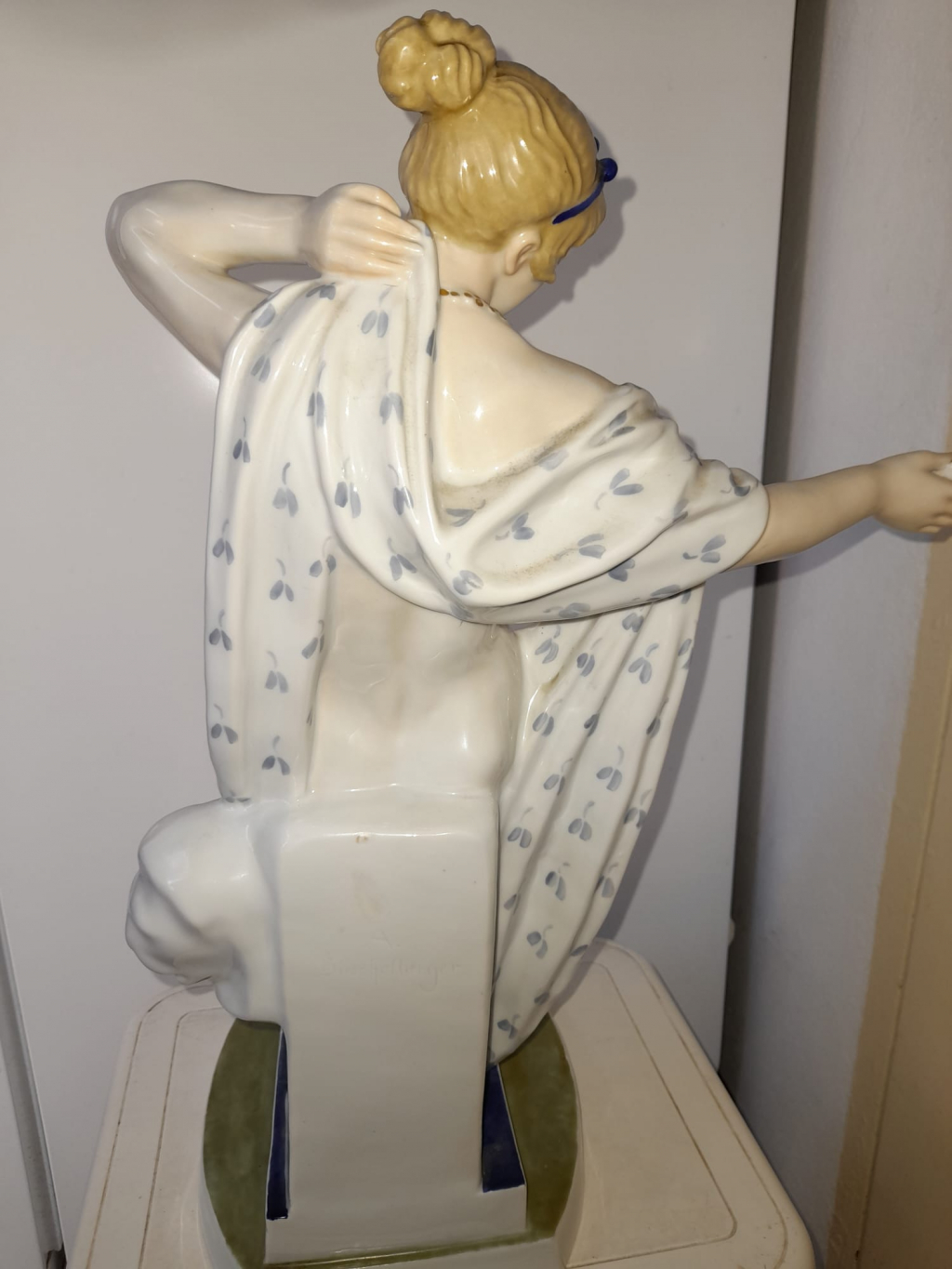 "Statuette Hauteur 45 cm, socle 21.5/17.5 cm A. Buschelberger (au dos) visible sur la photo n°3 Coupelle en main droite endommagé (petit éclat) et index main droite manquant (derrière la coupelle)"