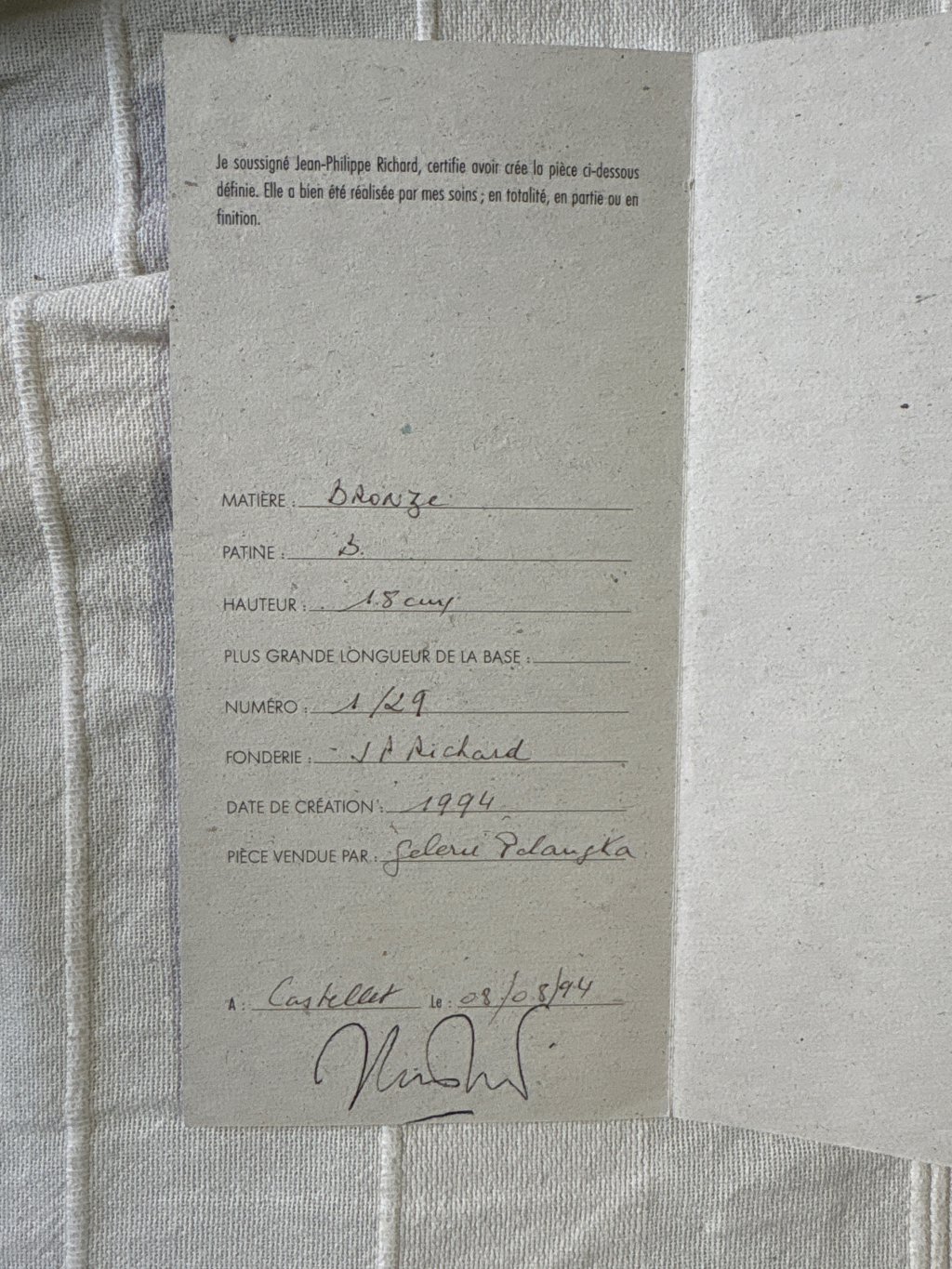 "Statuette en bronze 18cm de Jean-Philippe RICHARD, portant le numéro 1/29 de 1994. Certificat d authenticité - signature sous la statuette."