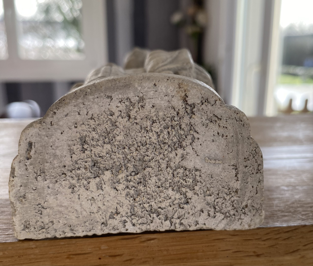 "Sculpture d’une statuette de la vierge Marie avec son enfant Jésus Matière en Pierre calcaire Hauteur de la statuette 20 cm environ Sa base est de 6 cm environ Le poids de la statuette est de 687 g environ"