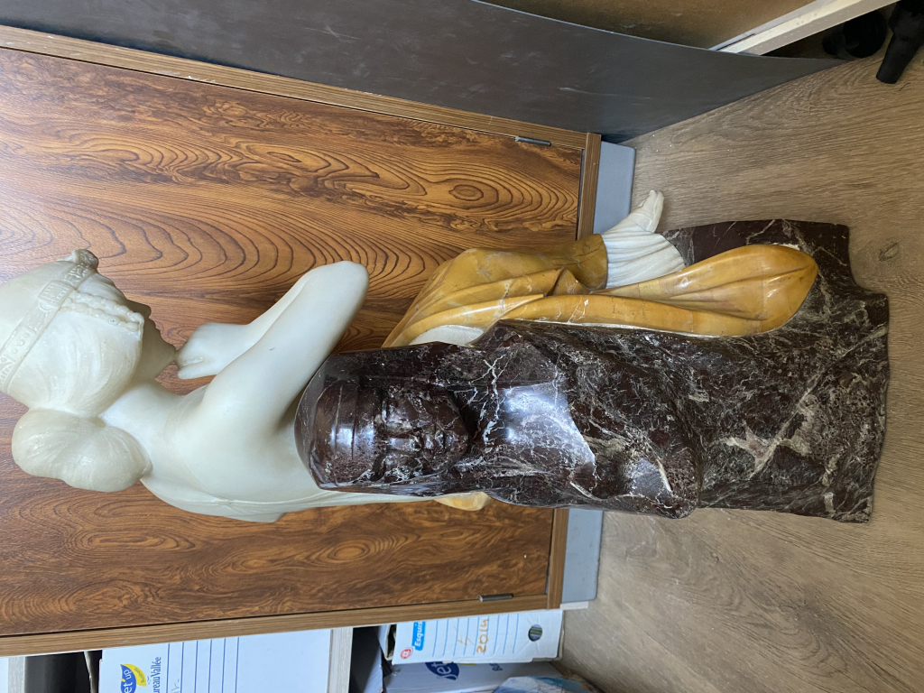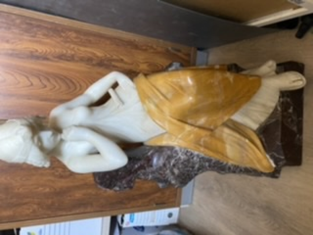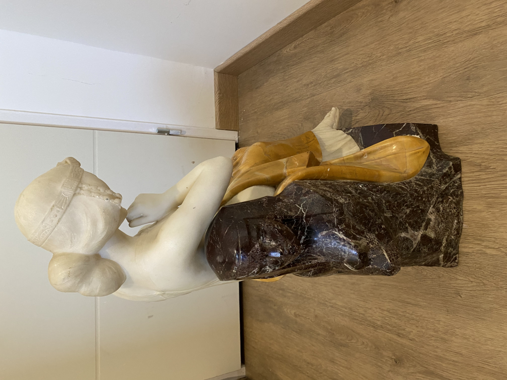 "C’est une statue en marbre (différentes couleurs) elle représente une femme sur un sphinx elle mesure 32cm de large et 66cm de haut. Elle est gravée à l arrière"
