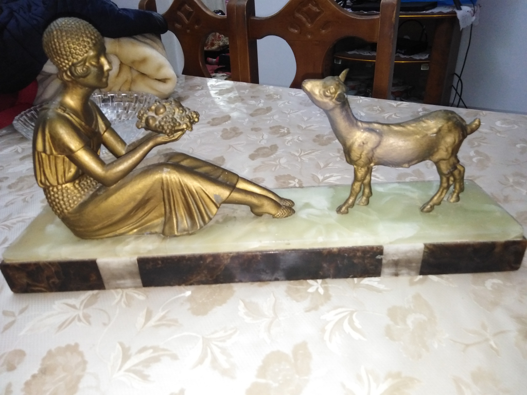 "une sculpture en bronze représentant une femme avec une chèvre signée D. H. Chiparus. Cette sculpture était à mes grands parents qui ne sont plus de ce monde. Elle est en très bon état. Hauteur : 24,5 cm - Largeur : 50 cm - Profondeur : 10,5 cm. Socle : 4,5 cm."