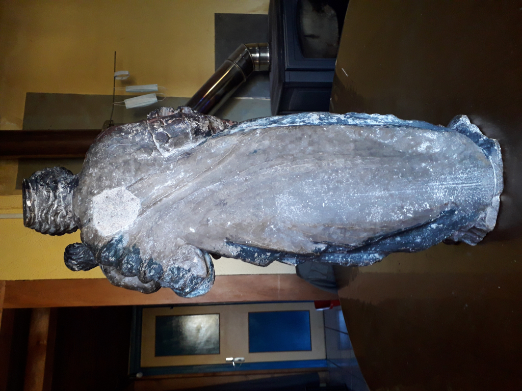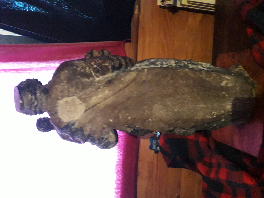 "Statue appartenant à ma famille originaire du Nord de la France .Elle est en pierre sculptée , le bras de la vierge où la main est manquante est creusé et il semble qu'il y ait du plâtre .Il est est de même pour l enfant à la main droite."