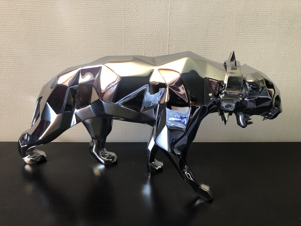 "Sculpture Richard Orlinski : Wild panther 70 cm en bronze chromé Modèle avec collier Édition artiste 2/4 Achat 2015 Tres bon état général, n’a pas bougé de son lieu d exposition depuis l’achat en 2015"